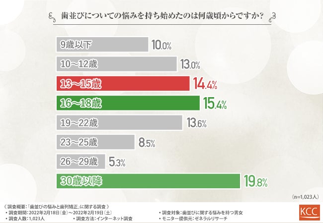 「歯並びについての悩みを持ち始めたのは何歳頃からですか?」と質問したところ、『30歳以降(19.8%)』と回答した方が最も多く、次いで『16~18歳(15.4%)』『13~15歳(14.4%)』と続きました。