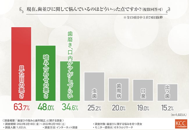 見た目が悪いことで悩んでいる方が6割以上に上り、嚙み合わせが悪いことや口内ケア、虫歯といった機能面での悩みを上回りました。