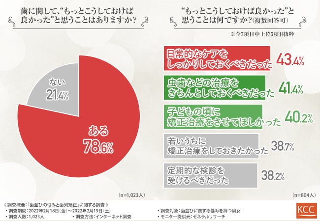 「歯に関して、“もっとこうしておけば良かった”と思うことはありますか?」と質問したところ、『ある(78.6%)』『ない(21.4%)』という結果になりました。