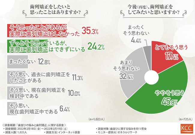 そこで、「歯列矯正をしたいと思ったことはありますか?」と質問したところ、『そう思ったことがあるが、実際に歯列矯正はしなかった(35.3%)』と回答した方が最も多く、次いで『ずっとそう思っているが、実際に歯列矯正はできずにいる(24.2%)』と続きました。