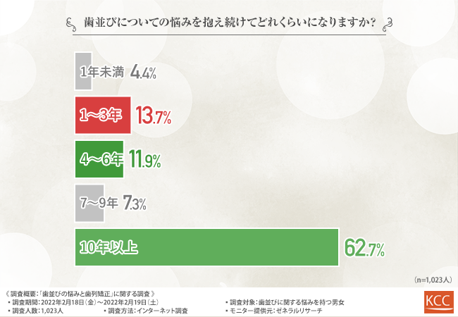 「歯並びについての悩みを抱え続けてどれくらいになりますか?」と質問したところ、『10年以上(62.7%)』と回答した方が最も多く、次いで『1~3年(13.7%)』『4~6年(11.9%)』と続きました。