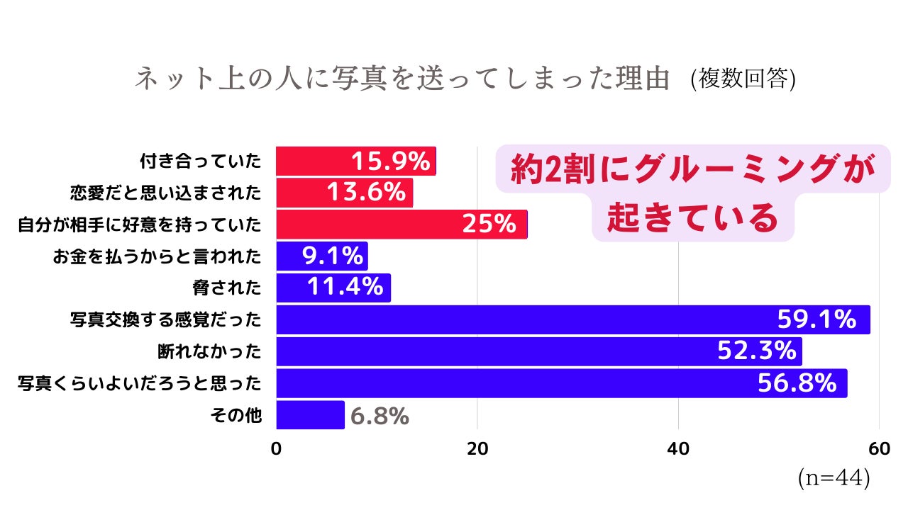 写真を送った理由としては、「向こうも写真を送ってきて交換をする感覚だった」が59.1%と最も多く、次いで「写真くらいよいだろうと思った」が56.8%となっている。相手をある程度信頼している心理が働いており、顔写真を送るリスクがあまり共有されていないことがうかがえる。