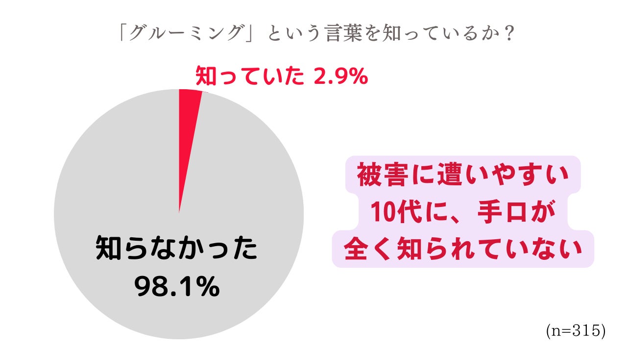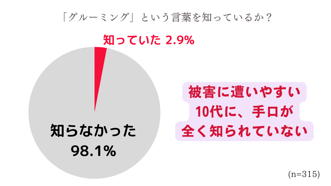 Tiktok上でのアンケートでは、たった2.9%の人しかグルーミングを知らない結果に。被害が無数にある一方で、言葉や実態が被害に遭いやすい10代にまだまだ知られていない。