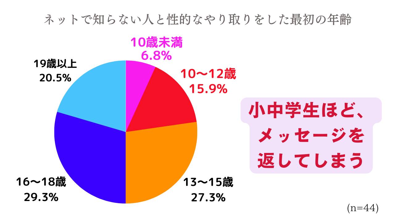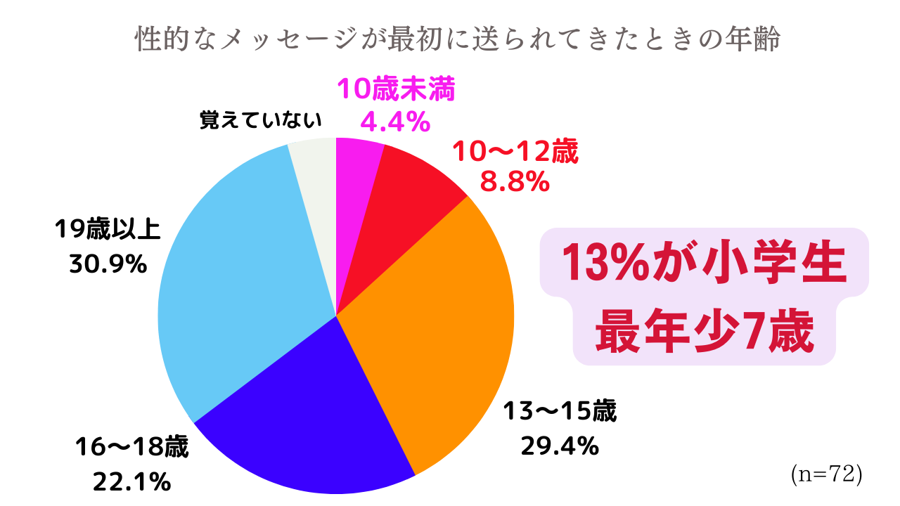 最年少は7歳で、14歳での被害が最多。半数近くが中学生までに、ネット上で性的なメッセージを送り付けられる被害に遭っている。
