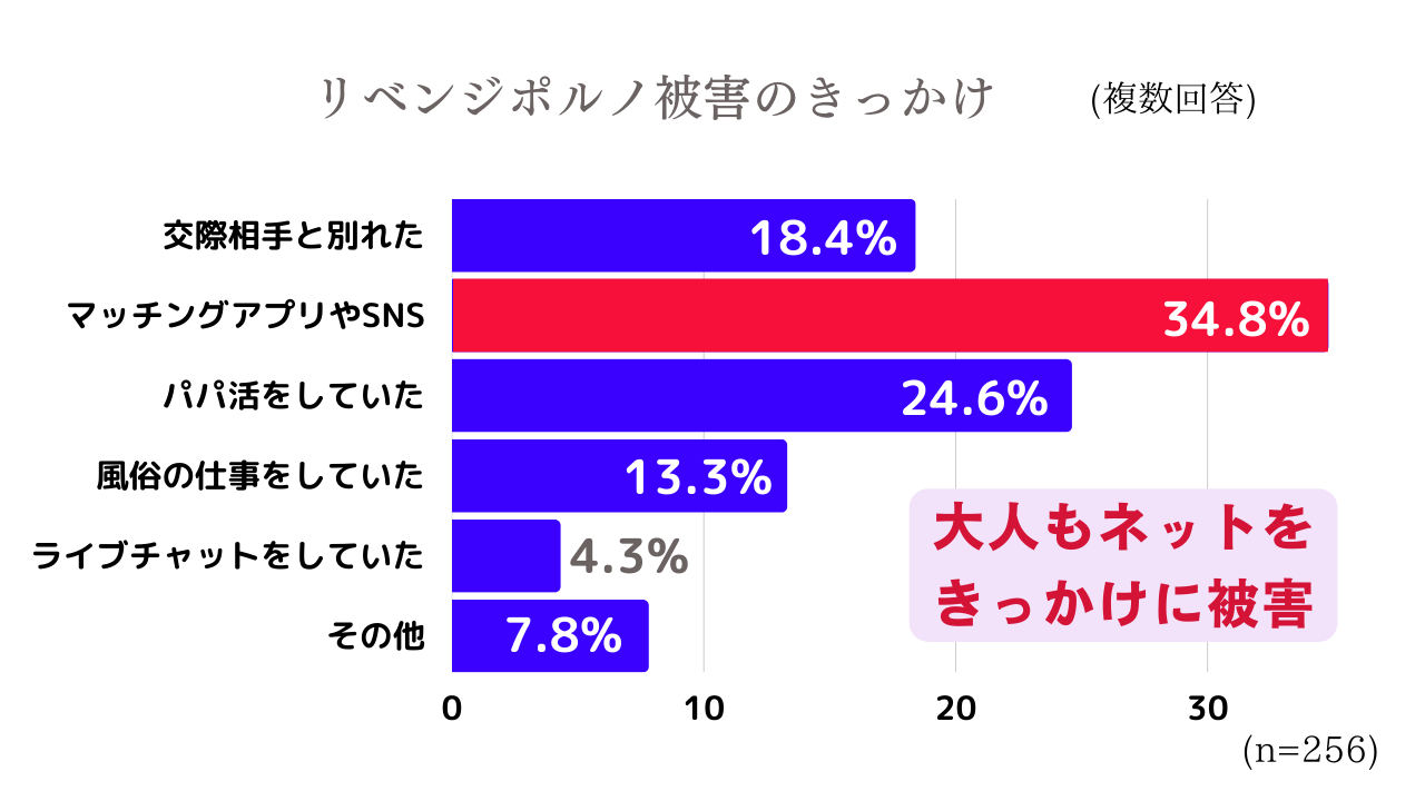 リベンジポルノの被害に遭った経験のある人(HIMEPA利用者)256人に聞いたところ、リベンジポルノ被害のきっかけは、「マッチングアプリやSNS」が34.8%と最も多かった。