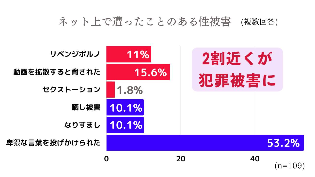 「リベンジポルノ(裸や下着姿の写真・動画を拡散された)」が11%、「画像や動画を拡散すると脅された(実際は拡散されなかった)」が15.6%、「セクストーション(お金を払わないと画像を知り合いに送ると脅された)」が1.8%と、一般向けの調査であるにも関わらず、全回答者のうち2割近くはネットで犯罪被害に遭っていた。