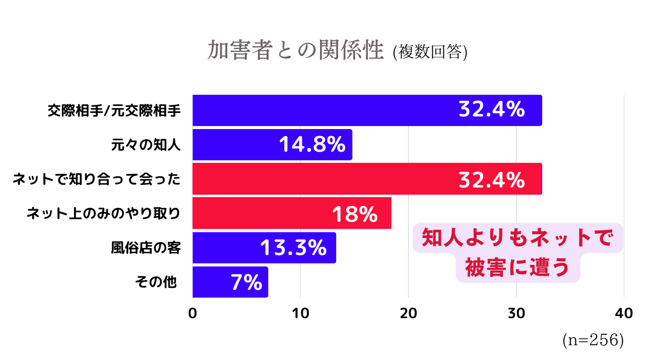 加害者との関係性では、「ネット上で知り合って実際に遭った人」が最も多かった。