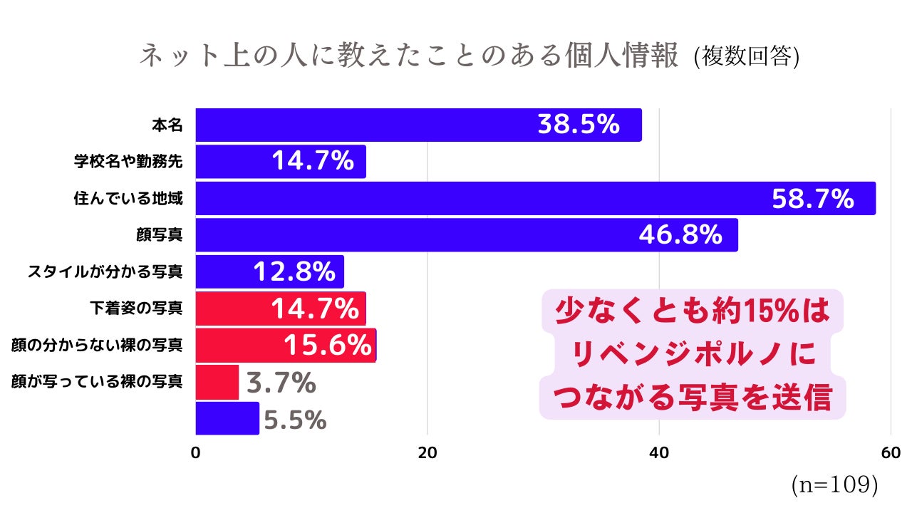 また、「下着姿の写真」「顔の写っていない裸の写真」「顔が写っている裸の写真」といった、重大なリベンジポルノ被害につながる写真を送ってしまった経験のある人が、全体の15%以上もいる深刻な状況も浮き彫りになった。