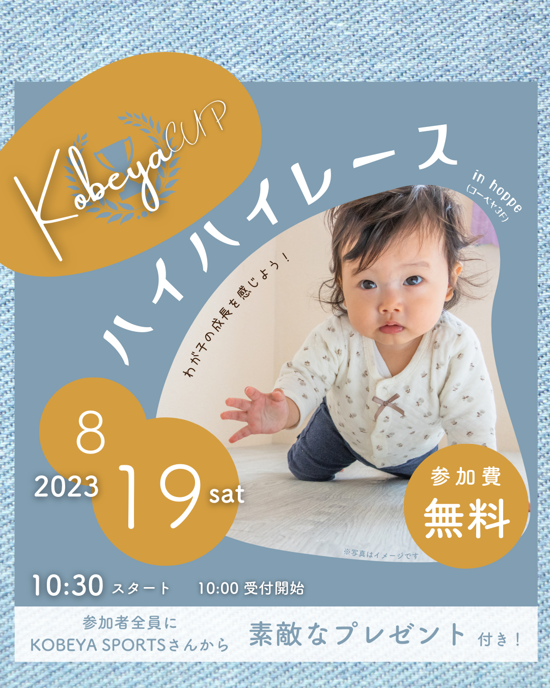 特定非営利活動法人ほっぺ(代表:大森 奈津子)による赤ちゃん向けイベントとして、2023年8月19日(土)にhoppe(コーベヤスポーツ三木店3階)にて、「hoppeハイハイレース~Kobeya CUP!~」を開催いたします。KOBEYA SPORTSとの共催となります。