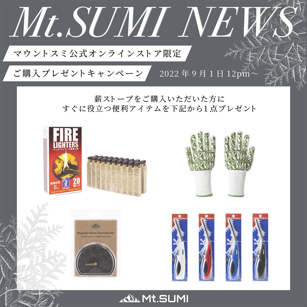 今期、マウントスミ公式オンラインストアからアウトドア薪ストーブAURA・EMO・COZYをご購入いただくと、もれなく下記の商品からお好きな1点をプレゼント!