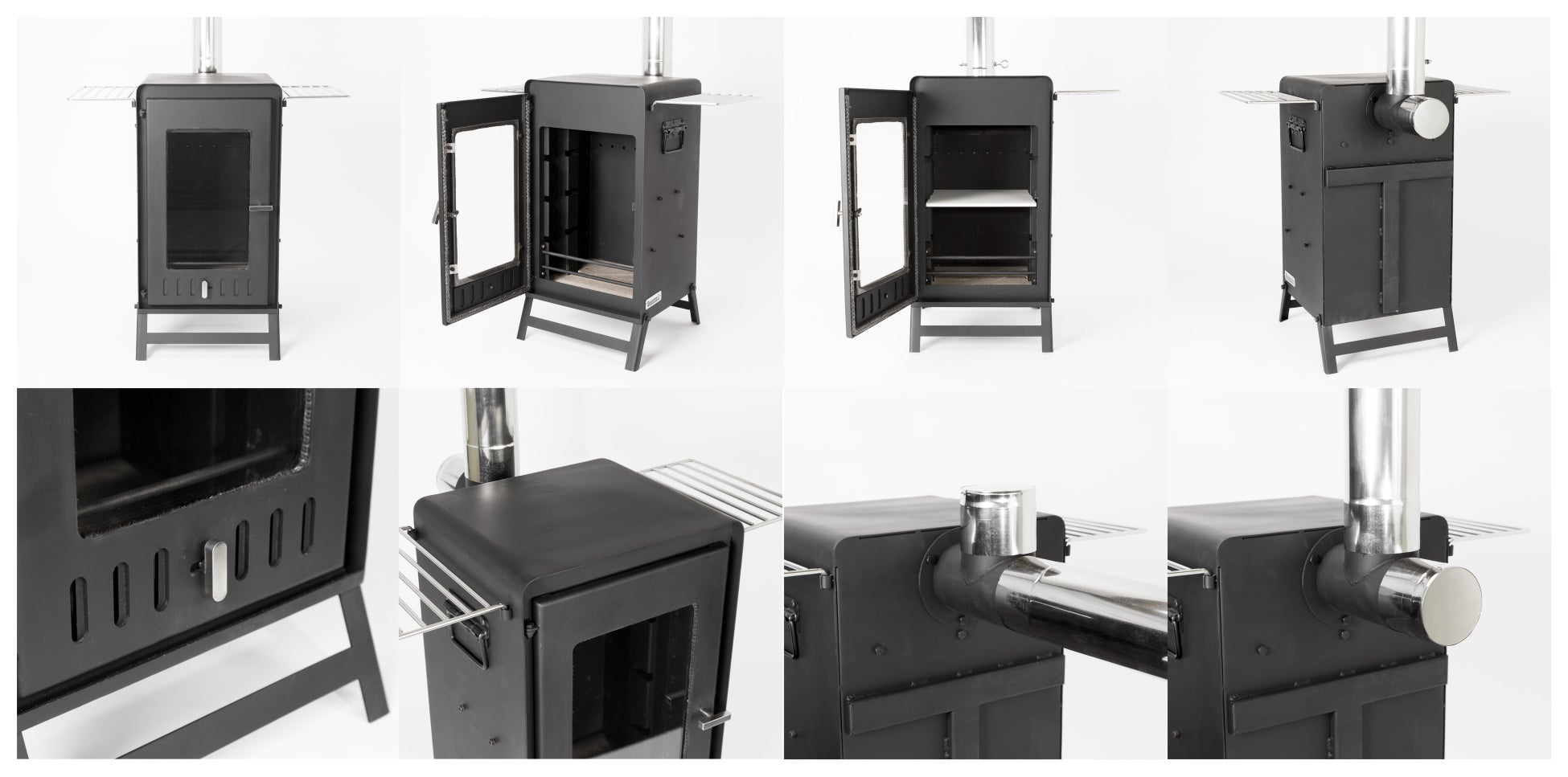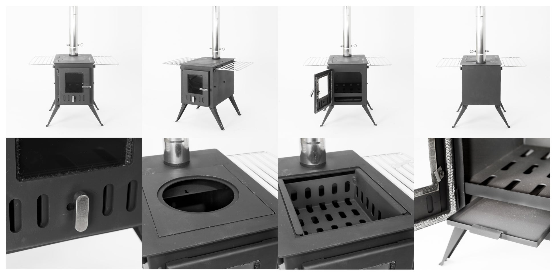 どれも両サイドにグリッドを差し込めば調理器具を乗せることができ、オプションのピザストーンやストーブ側面でお湯が沸かせるウォータータンクを使うと、さらに料理の幅が広がります。