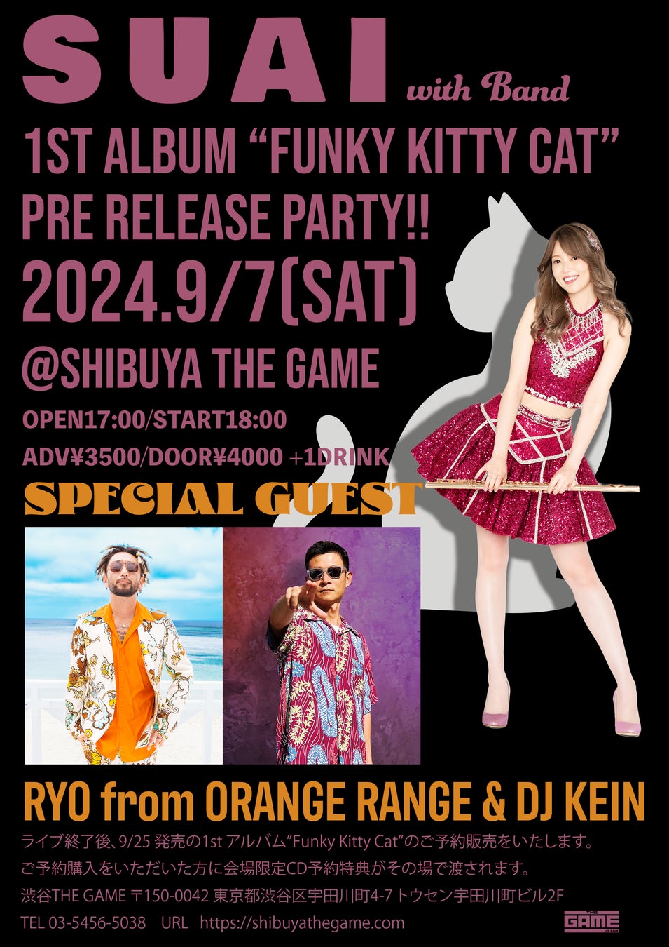 また、今期リリース予定のSUAI 1st ALBUM ″Funky Kitty Cat″を記念したプレリリースパーティーが9月7日にSHIBUYA THE GAMEにて開催される。