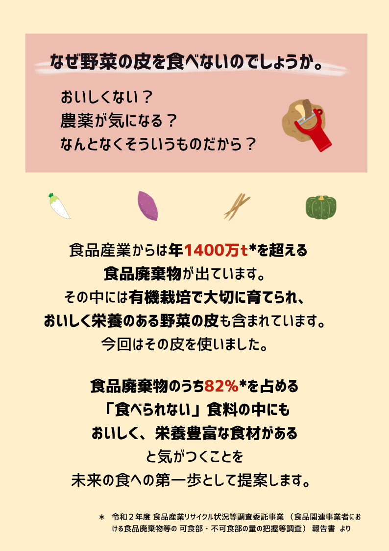 「皮ったスープ」(全4種)には、食品工場で廃棄される有機栽培の野菜の皮と、椎茸の足(軸)を使用しています。有機栽培で大切に育てられ、おいしく栄養のある野菜の皮を使うことで、栄養価の高いスープに仕上がるとともに、食品廃棄物の中にもおいしく栄養豊富な食材があることに気づき、未来の食への第一歩として提案します。