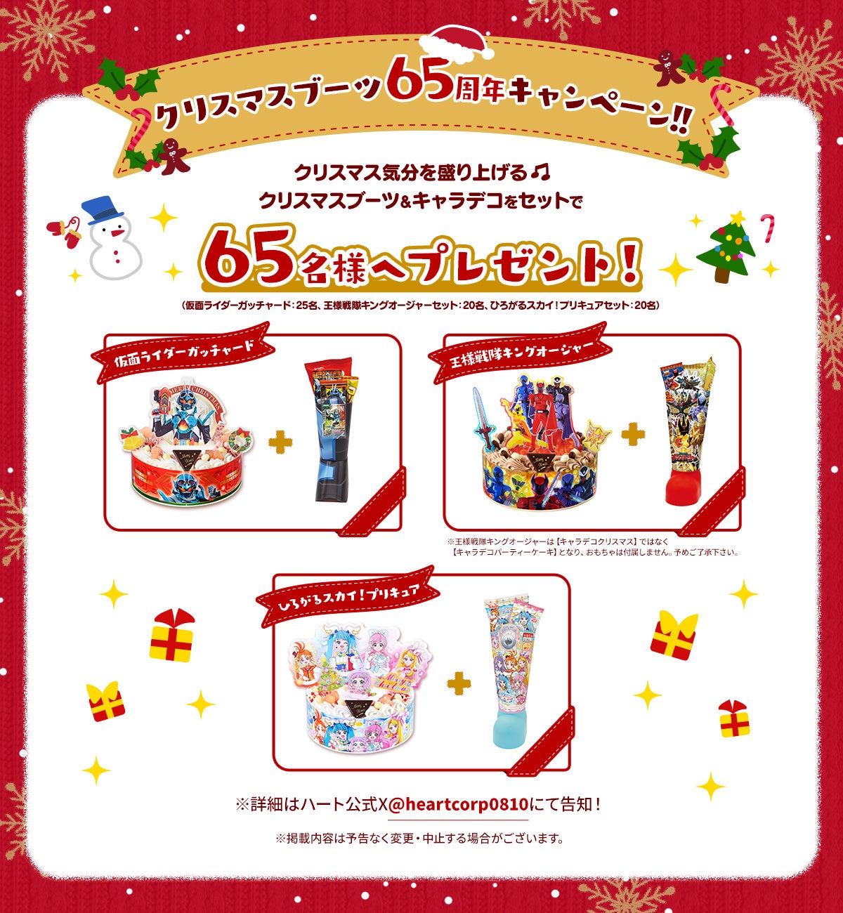 株式会社ハート(代表取締役社長:杉崎 晋哉、本社:東京都台東区)では、株式会社ハート創業の前身となる個人商店時代より展開している『クリスマスブーツ』の販売65周年を記念し、抽選で65名さまに『クリスマスブーツ』(発売元:株式会社ハート)と『キャラデコ®』(発売元:株式会社バンダイ)がセットで当たるプレゼントキャンペーンをハート公式Xにて実施いたします。