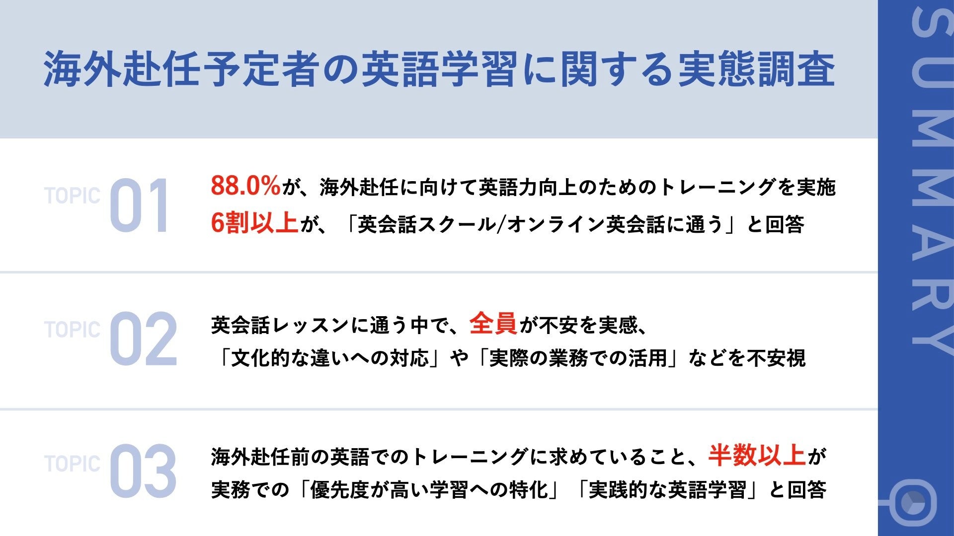 - 海外赴任に向けた英語力向上のため、88.0%が「トレーニングしている」と回答