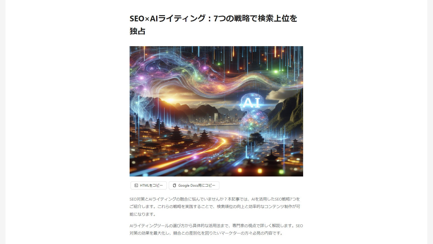 生成された本文には箇条書きや表も含まれます。HTMLやGoogleドキュメント用にコピーして全文を貼付可能です。 |
