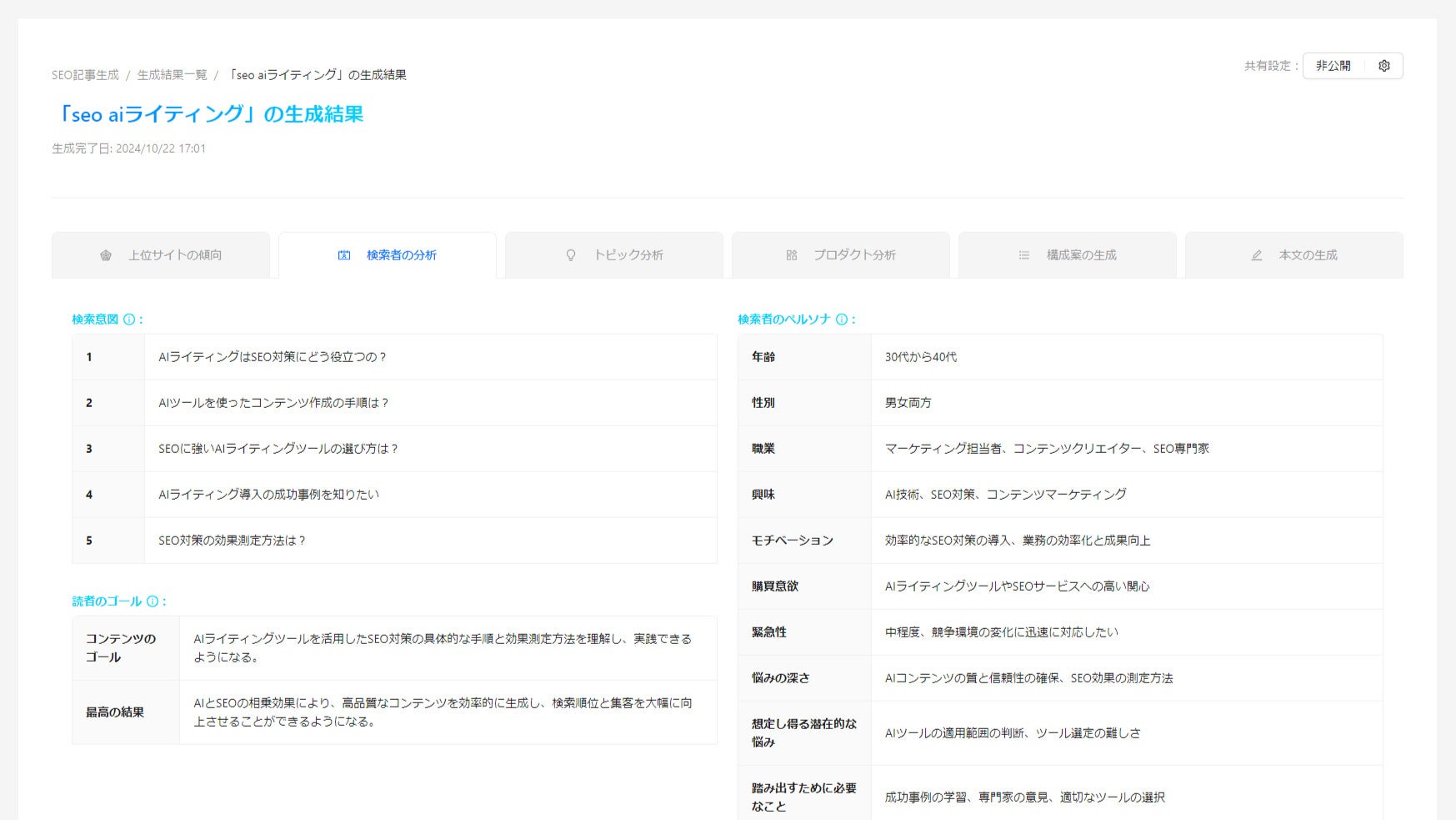 さらに検索者の中央値的なペルソナを定義し、読者が目指す結果やコンテンツによって達成されるべきゴールを生成します。記事の方針を言語化することで、関係者間のズレをなくすことが可能です。