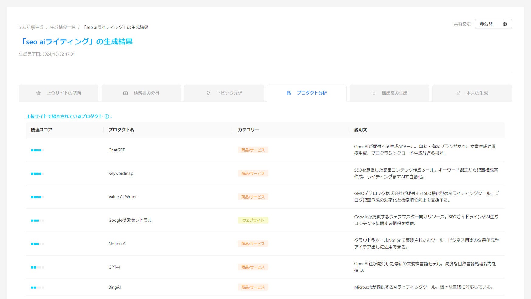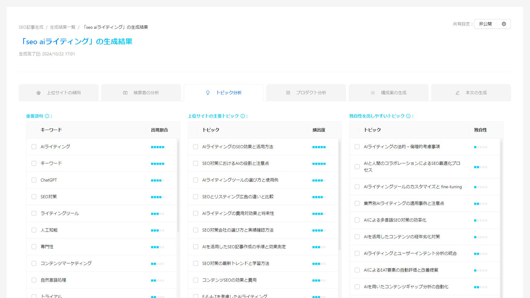 検索上位のサイトで頻出する重要語句、そして従来は経験豊富なディレクターが目視で集めることしかできなかった「上位サイトが実際にどのようなトピックを言及しているか」を整理して抽出します。