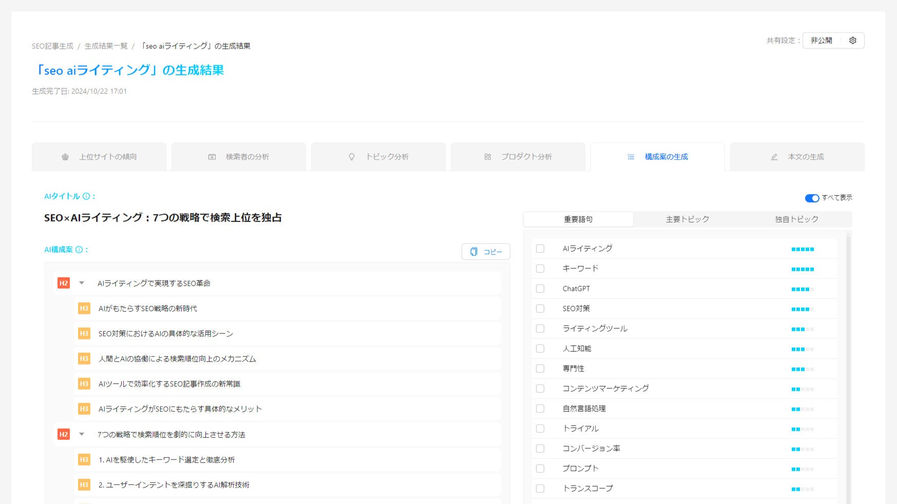 リサーチ・分析結果の出力と同時に、構成案とタイトルが生成されます。生成された構成案やタイトルは編集が可能です。本文の生成前にカスタマイズできるため、イメージ通りの記事をあっという間に作成できます。