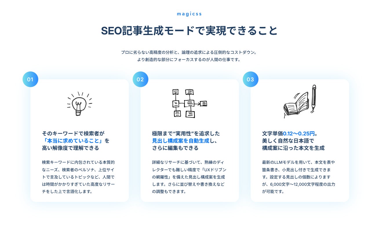 プロの業務プロセスを再現するAIツール「magicss(マジックス)」が、第一弾としてSEO記事生成モードをリリース!高品質なコンテンツを効率的に作成し、Webマーケティングの課題を解決します。