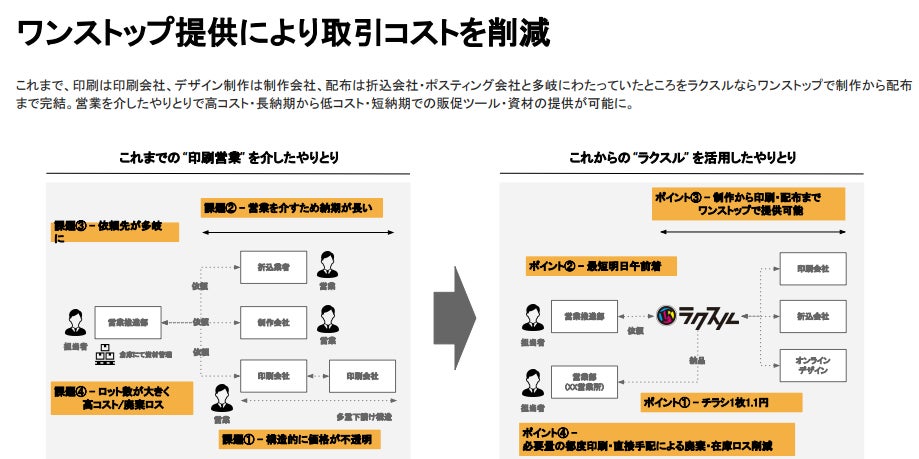 これまで販促業務における印刷物の制作は、パートナーである印刷会社や広告代理店・販促会社に制作から印刷までを一括で依頼しているために工程が把握しづらい状況であったり、拠点ごとに発注先・方法が異なるために管理が行き届かなかったりと業務全体がブラックボックスとなっていました。他方でその課題を解決しようとネット印刷への切り替えを検討しても個人ベースの利用に最適化されており、大企業における利用には不向きで導入に至るハードルが越えられないという現実がありました。