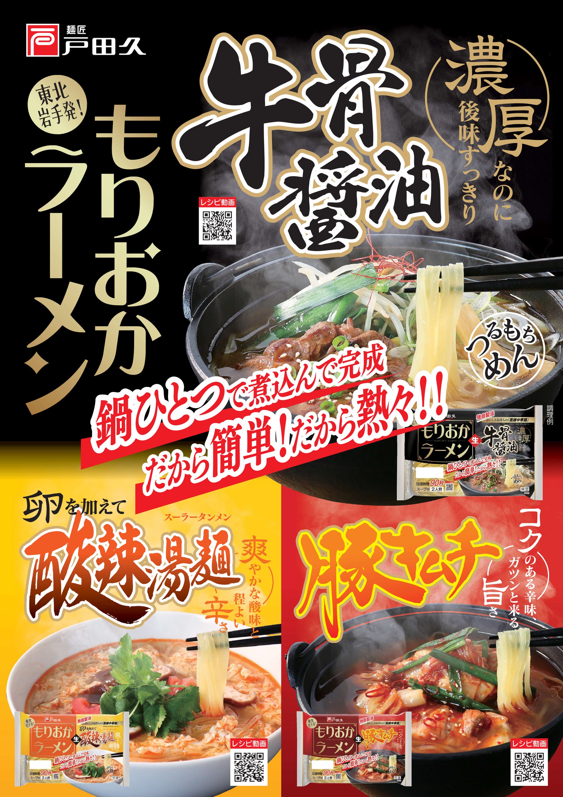 株式会社戸田久(本社:岩手県、 代表取締役社長:戸田 有恒 以下 戸田久)は、もりおか冷麺の姉妹品、鍋ひとつで簡単調理の「もりおかラーメン牛骨醤油」を2023年9月1日(金)より全国で販売します。