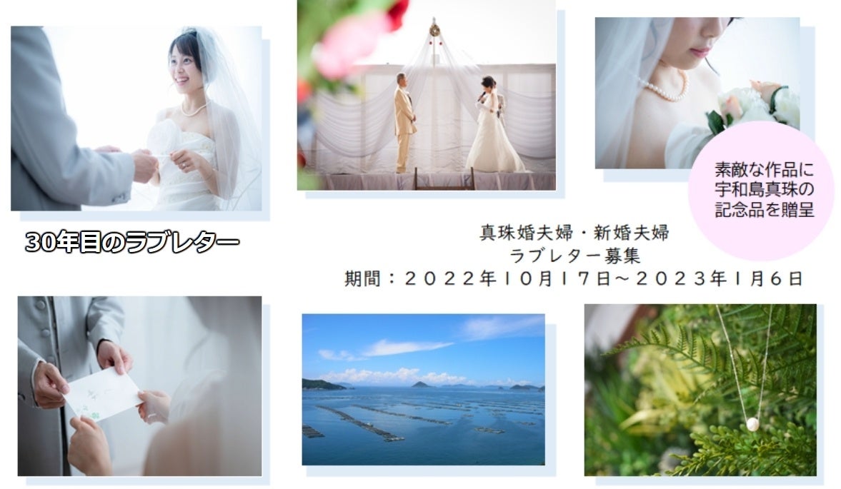 全国有数の真珠生産地である愛媛県宇和島市は、結婚30年目を迎えるご夫婦・結婚1年目の新婚ご夫婦からパートナーに宛てたラブレターを募集し、印象に残った作品を応募いただいたご夫婦に、記念品として宇和島真珠製品を贈呈します。