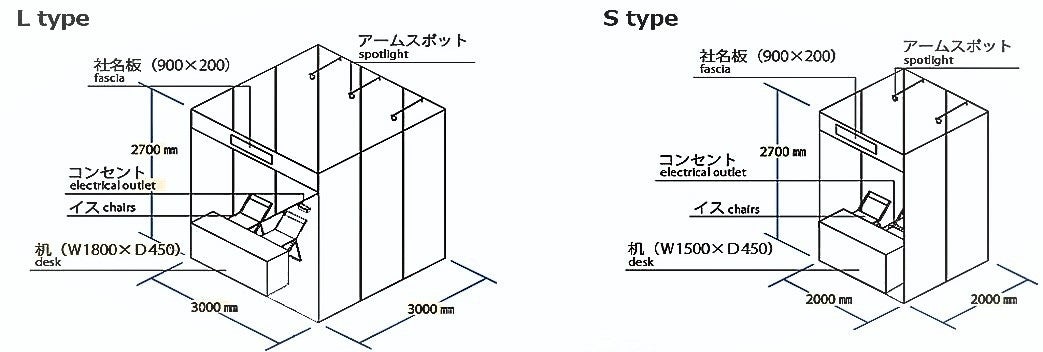 展示スペース(2m×2m)/サイドパネル/バックパネル/パラペット/社名版×1/ アームスポット/机×1/パイプイス×2/コンセント(100V500W)/ |