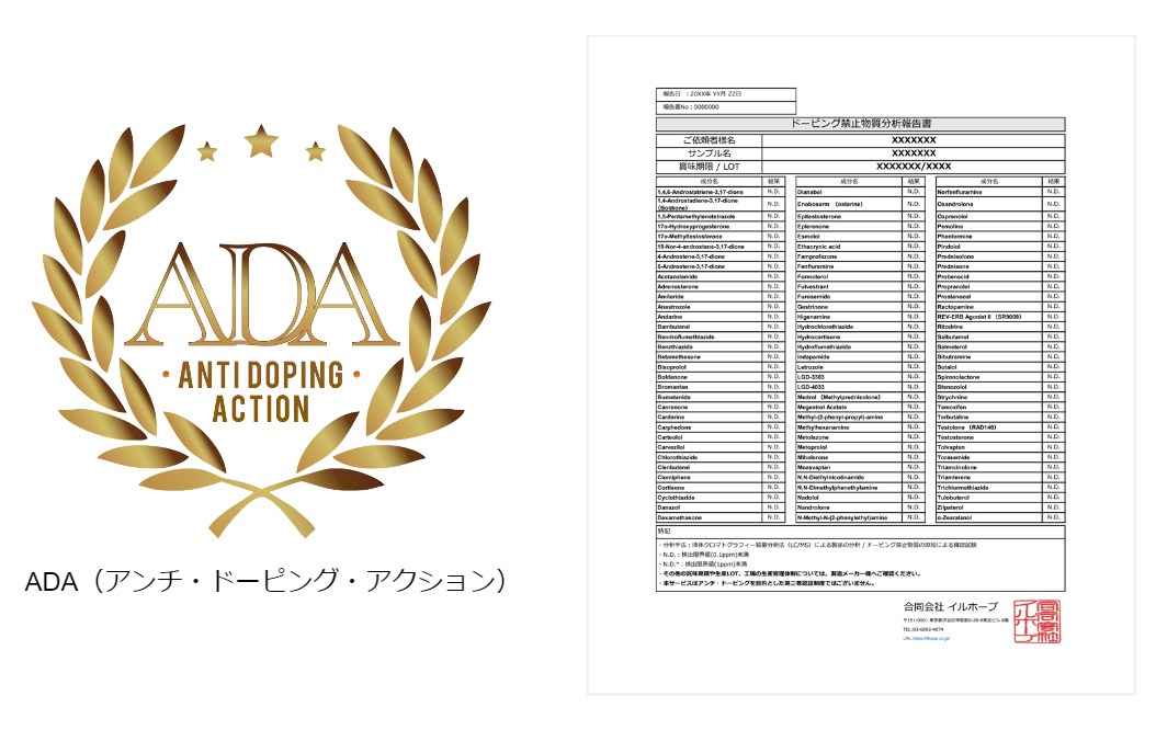 (同)イルホープではサプリメントや健康食品に対する、ドーピング禁止物質分析サービスを行っています。これまでは製品の分析を行い、当社の指定するドーピング禁止物質分析が検出されない場合は、報告書のみ発行(外部公開可能)をしておりましたが、サービス拡充の一環として分析済みを示すマーク「Anti Doping Action」の発行も行うことにいたしました。マークはweb等でのPRはもちろん商品への印字も可能なため、ユーザーの安心感が高まり、より手に取りやすい仕組みが実現します。
