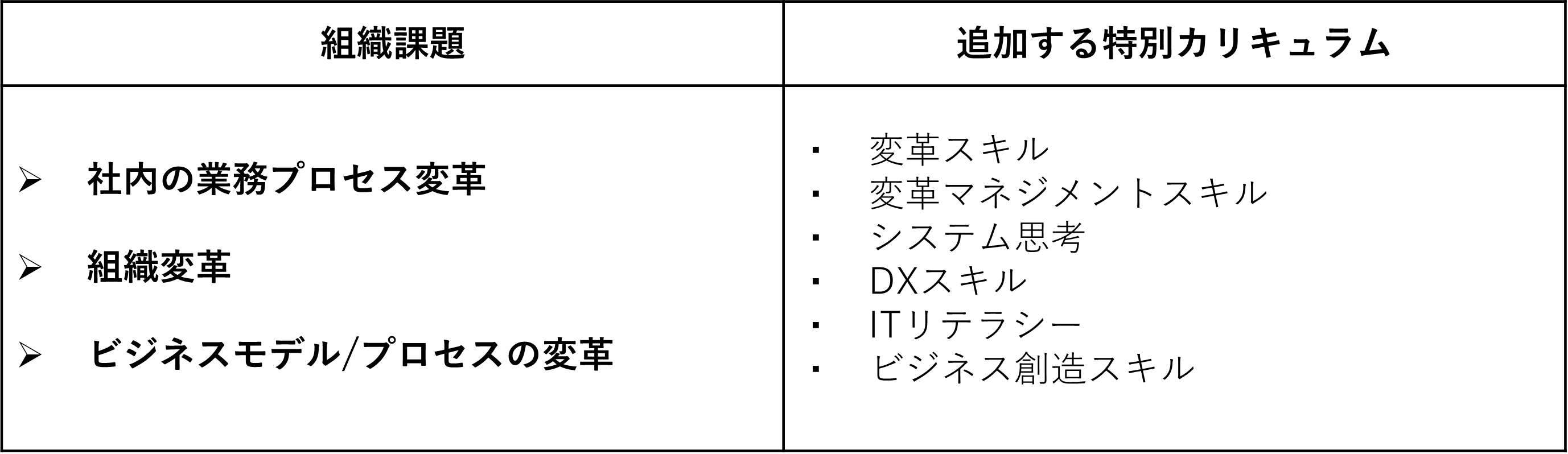 社内外に通用する、新たなスキルの獲得や更なるスキルアップはもちろん、組織課題に応じて独自にカスタマイズした特別カリキュラムも提供可能です。