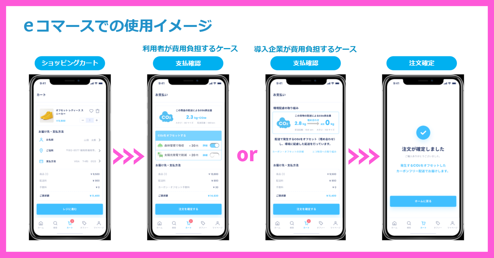 商品やサービスを販売するウェブサイトにSustineri のAPI を導入すると、販売する商品やサービスの提供に伴い排出される温室効果ガスを自動で算定し、導入企業の販売サイトで表示することが可能になります。また、算定した温室効果ガスをワンクリックで相殺(カーボン・オフセット)することができます。