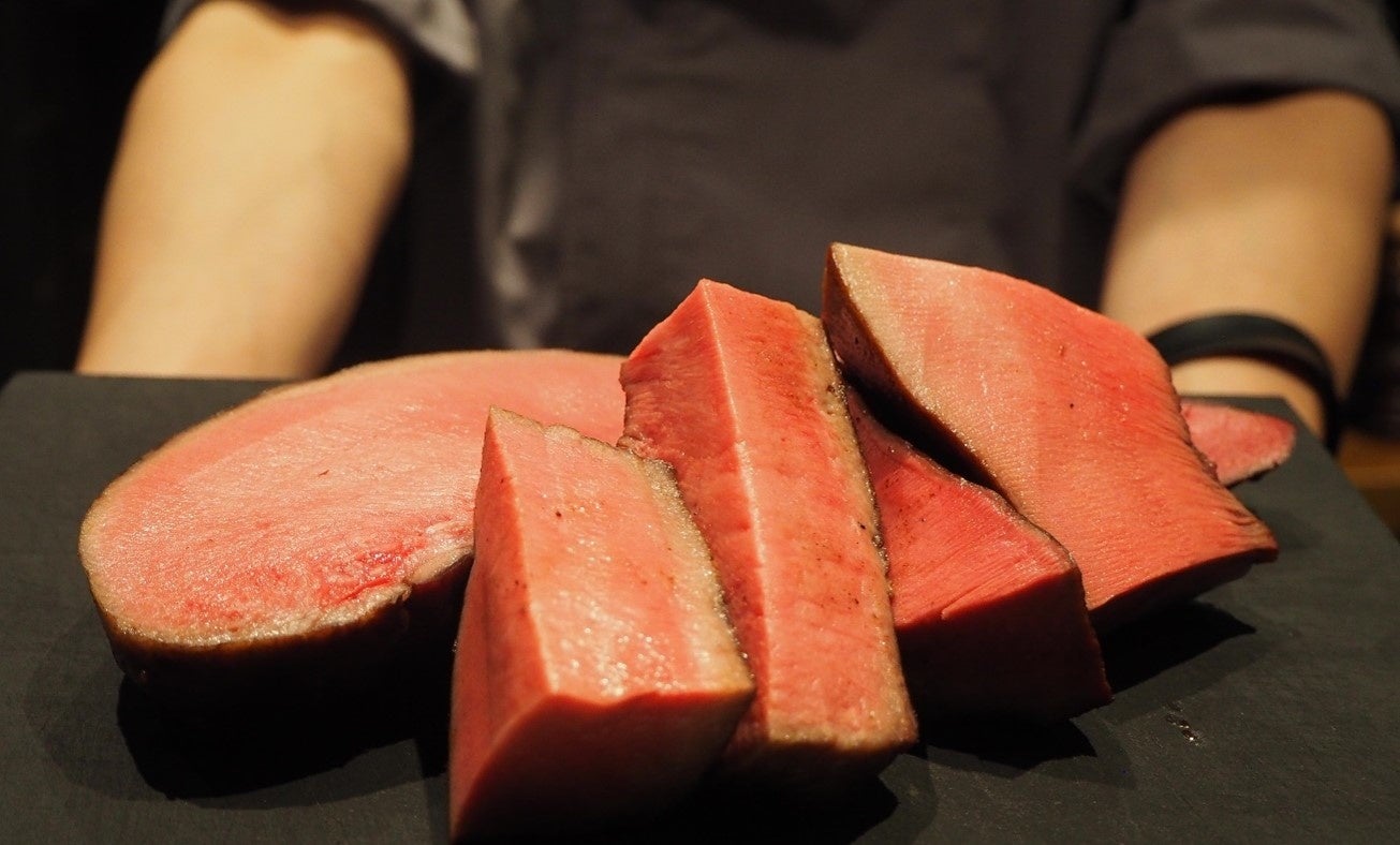 薪で焼き上げた丸ごとタンをお客様の前にワゴンで運び、カットいたします。焼き上げに1時間以上の時間を要すため、完全予約制でのご用意となります。お気軽にご連絡ください。¥22,000(ハーフサイズ¥11,000)