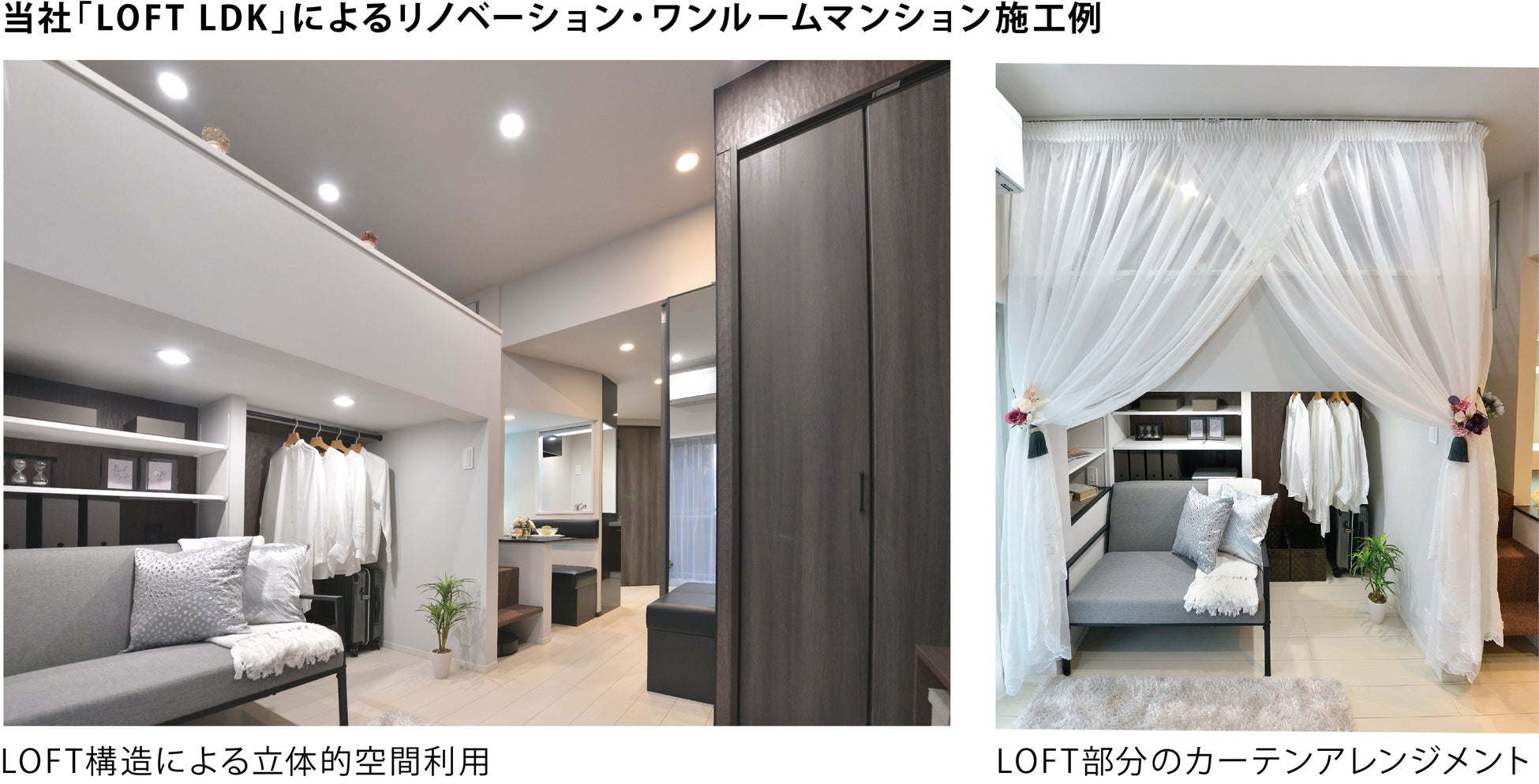 私たちが提案する「LOFT LDK」プランによるリノベーションは、コンパクトマンションでの新しい暮らし方の可能性を 広げて行くものだと確信しております。人口の集中する首都圏はもとより、限られた空間で豊かに、より快適に暮らす試みは これからの時代に促した、サスティナブルな取組でもあります。私たちは、「広さで諦めない暮らし」をこれからも追求しコンパクトな空間にこそ可能な楽しい空間利用の提案を続けてまいります。