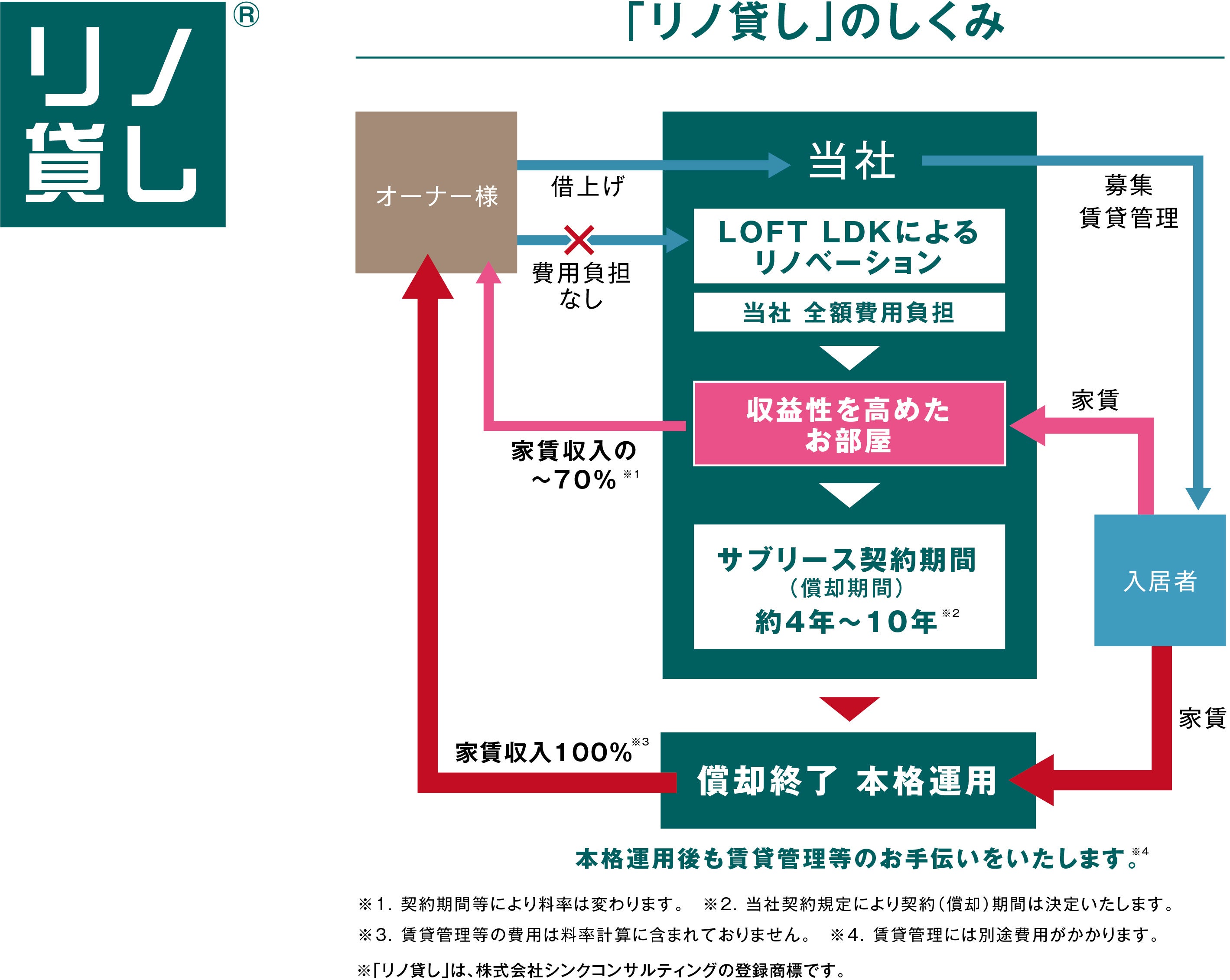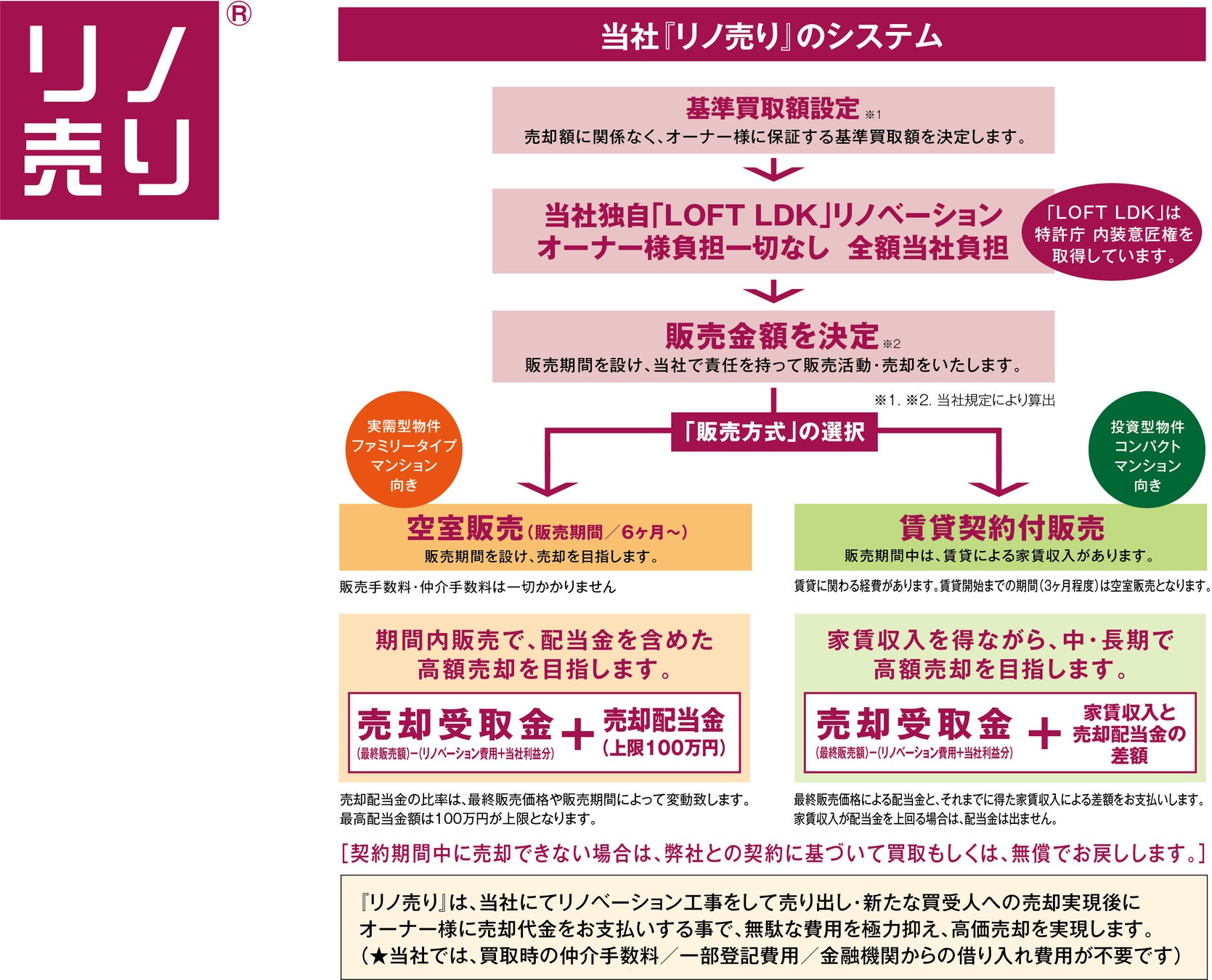 経年化したコンパクトマンションを高く売却するには、やはり「リノベーションによる物件価値向上」が必須です。しかし、リノベーション費用が大きくなると利幅は小さくなり、ましてや費用の先行投資となるので、先行きが見えないまま大規模なリノベーションに踏み切ることは難しいのが現実です。そのジレンマを解決した再販売方式が「リノ売り」です。「リノ売り」では、リノベーションにかかる費用は全て、当社負担で行います。特許庁・内装意匠権を取得の「LOFT LDK」プランによるリノベーションでお部屋の価値を可能な限り高め、その上で販売金額を設定し当社で再販売いたします。オーナー様へは、売却された最終金額から「リノベーション費用」と「当社利益分」を差し引きお支払いされるシステムです。さらに、最終売却金額により「売却配当金」をお支払いします。