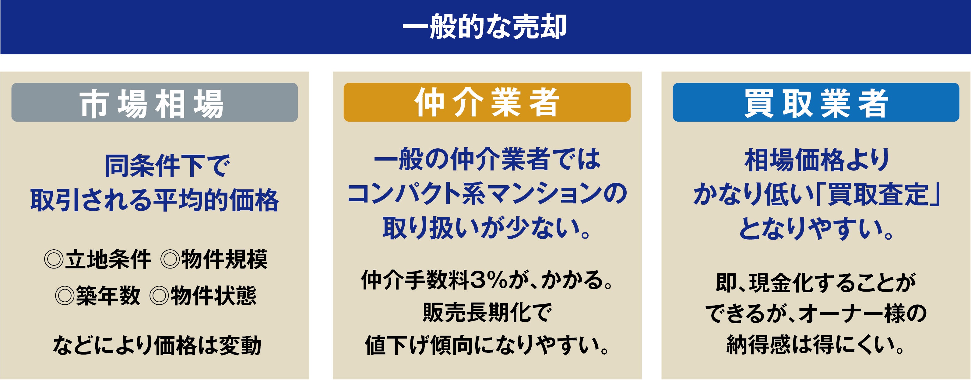 オーナー様がマンション等を売却する方法は、「仲介業者」による買主募集型販売と「買取業者」に直接売却するのが一般的です。コンパクト物件を再販売する場合は、一般の「仲介業者」ではそもそも取り扱い量が少なく、また販売手数料で収益を出す「仲介業者」は、価格が安目のコンパクトマンションはそもそもの収益も少なく取り扱い自体に消極的と言えます。「買取業者」においても買取後のリフォーム費用や販売期間の長期化など、販売にかかるリスク・経費を鑑みて買取価格を抑えた、厳しい「査定提示」となる事も多く、オーナー様の満足いく売却は難しいのが現実です。