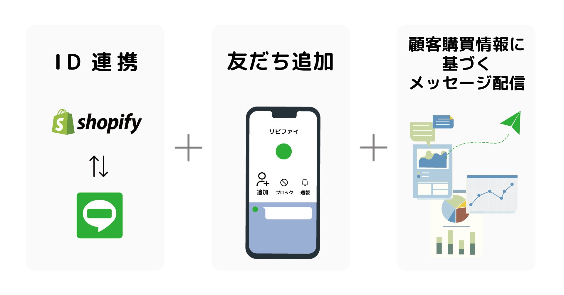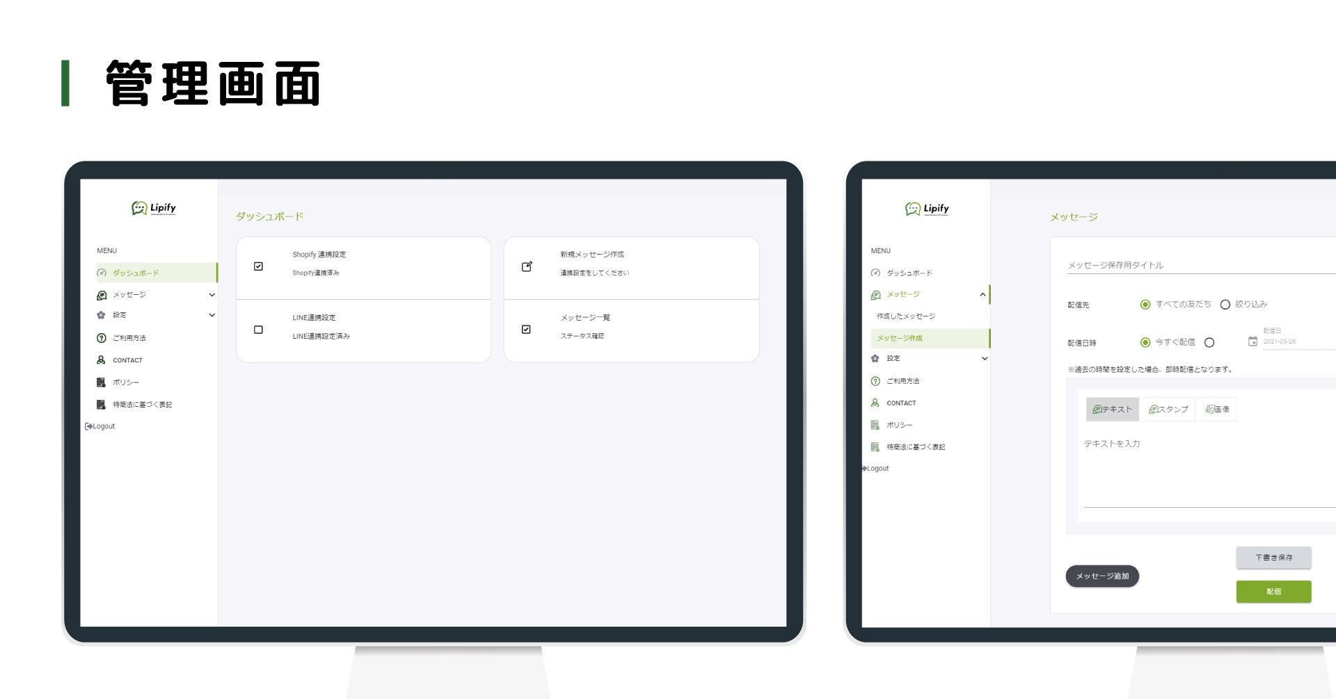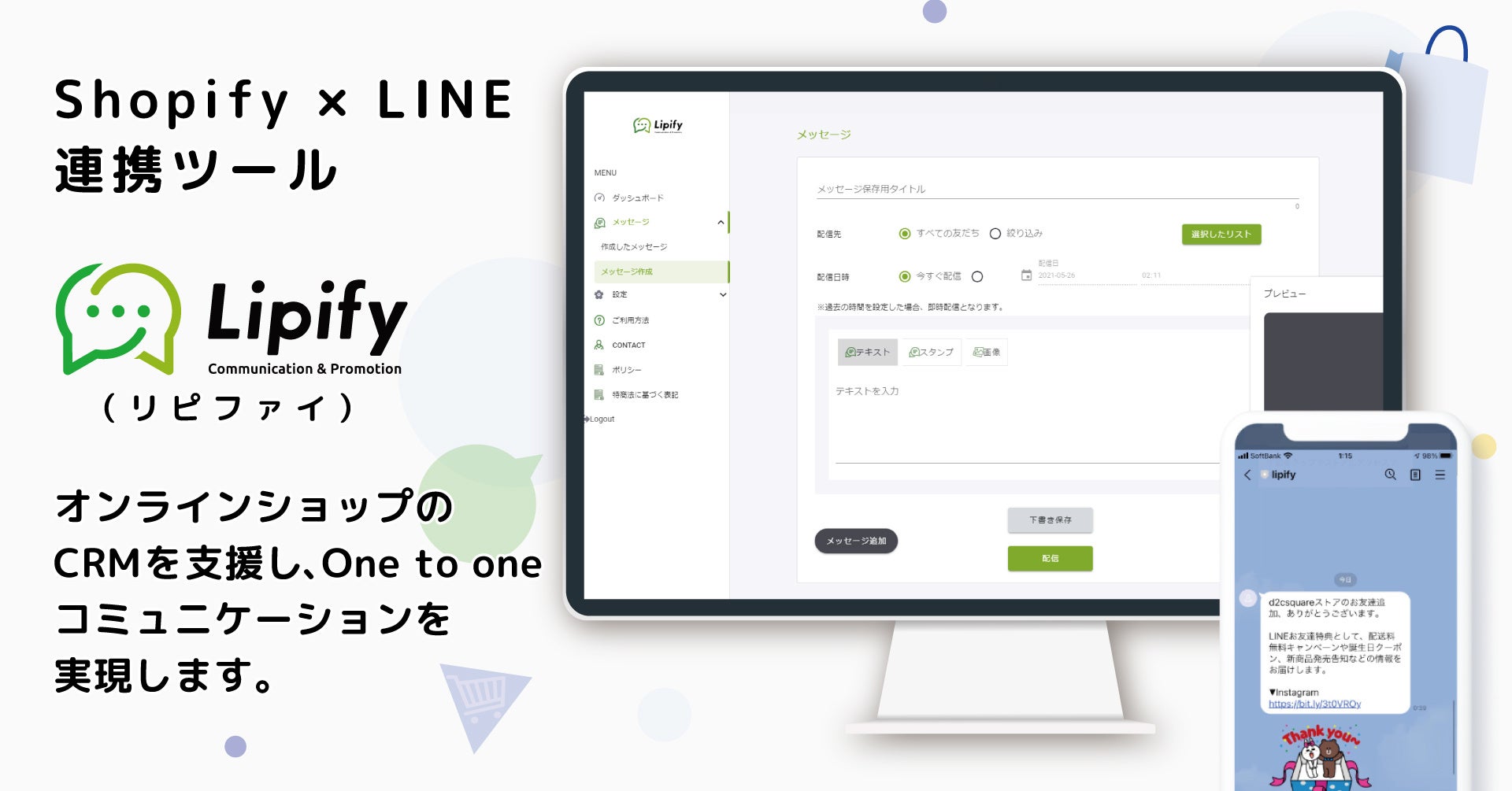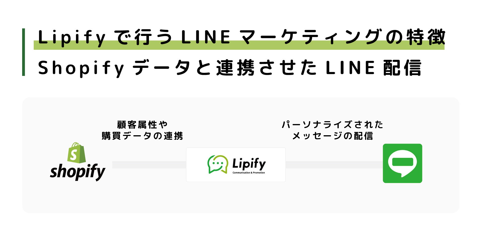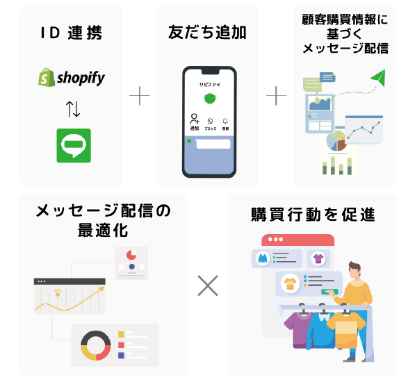 LipifyはShopifyとLINEを連携し、Shopifyに登録された情報や購買履歴に基づいたメッセージをLINEに配信できるShopifyアプリです。