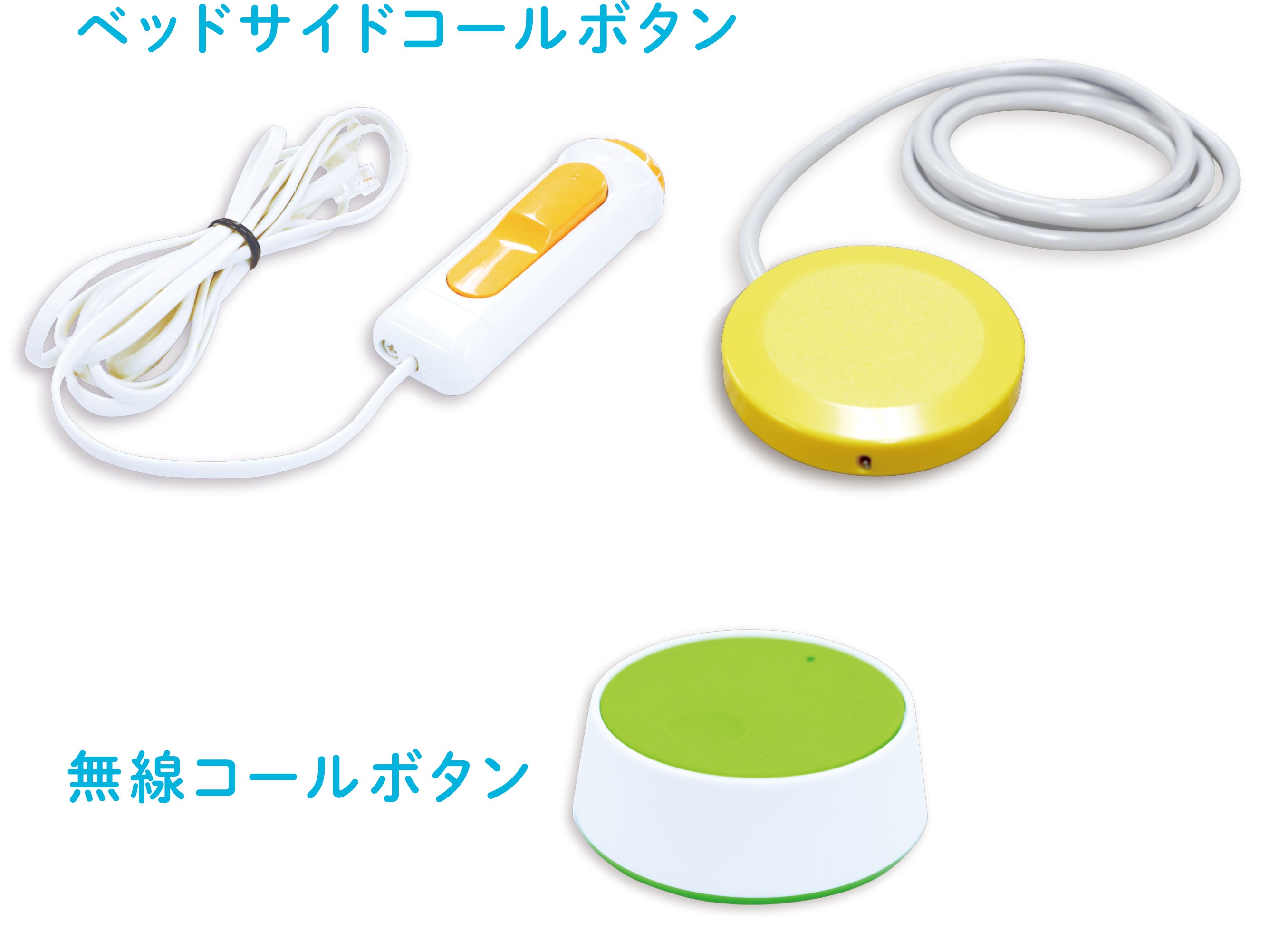 専用の呼び出しボタンを押すことで、職員様のスマートフォンに通知が届き、居室内のマイクスピーカーで会話することができます。また、呼び出しボタンは「手が不自由でボタンを握れない方用に大きなボタン」「必要な場所(トイレなど)に設置できるワイヤレスボタン」「握るタイプのボタン」と3種類ご用意しています。