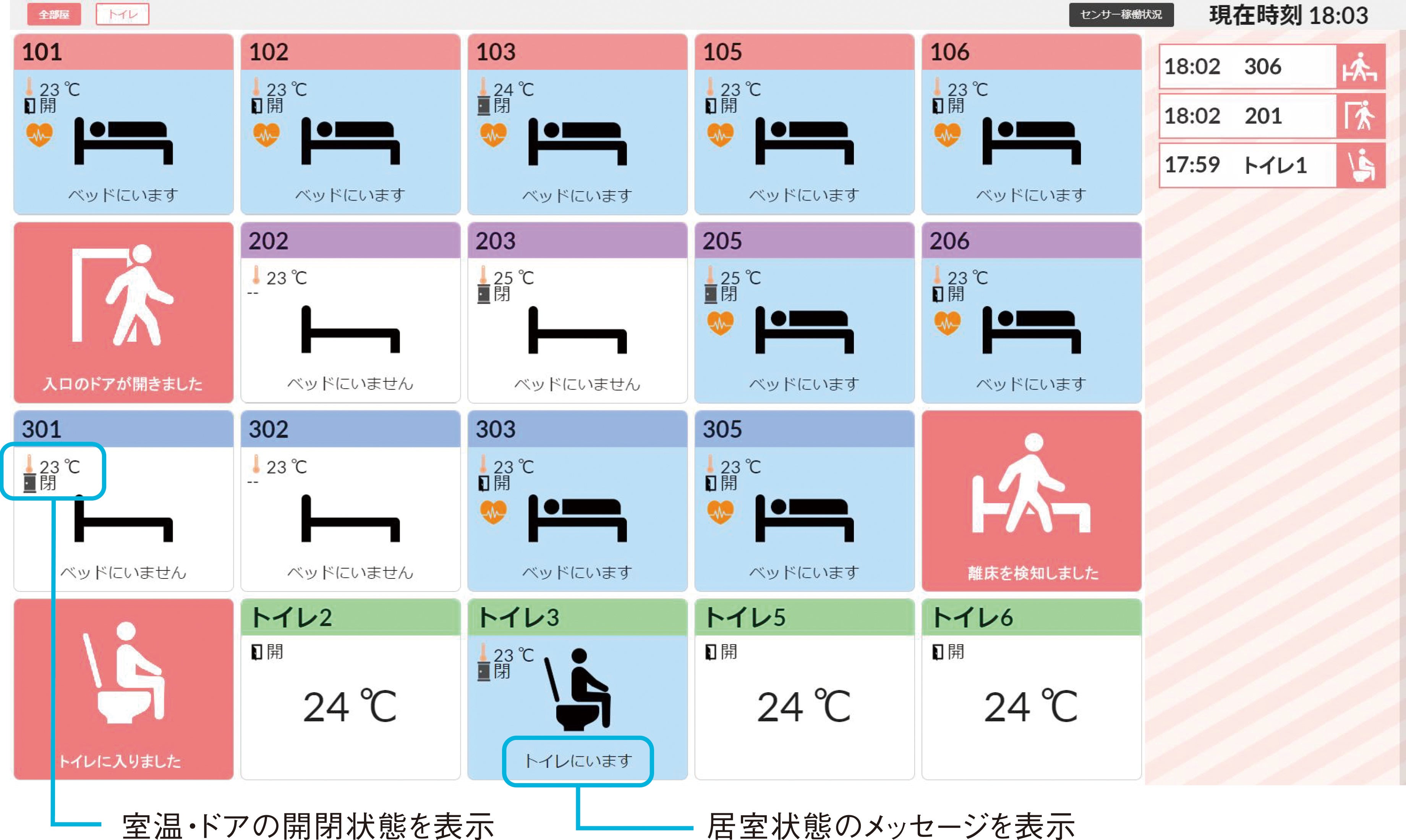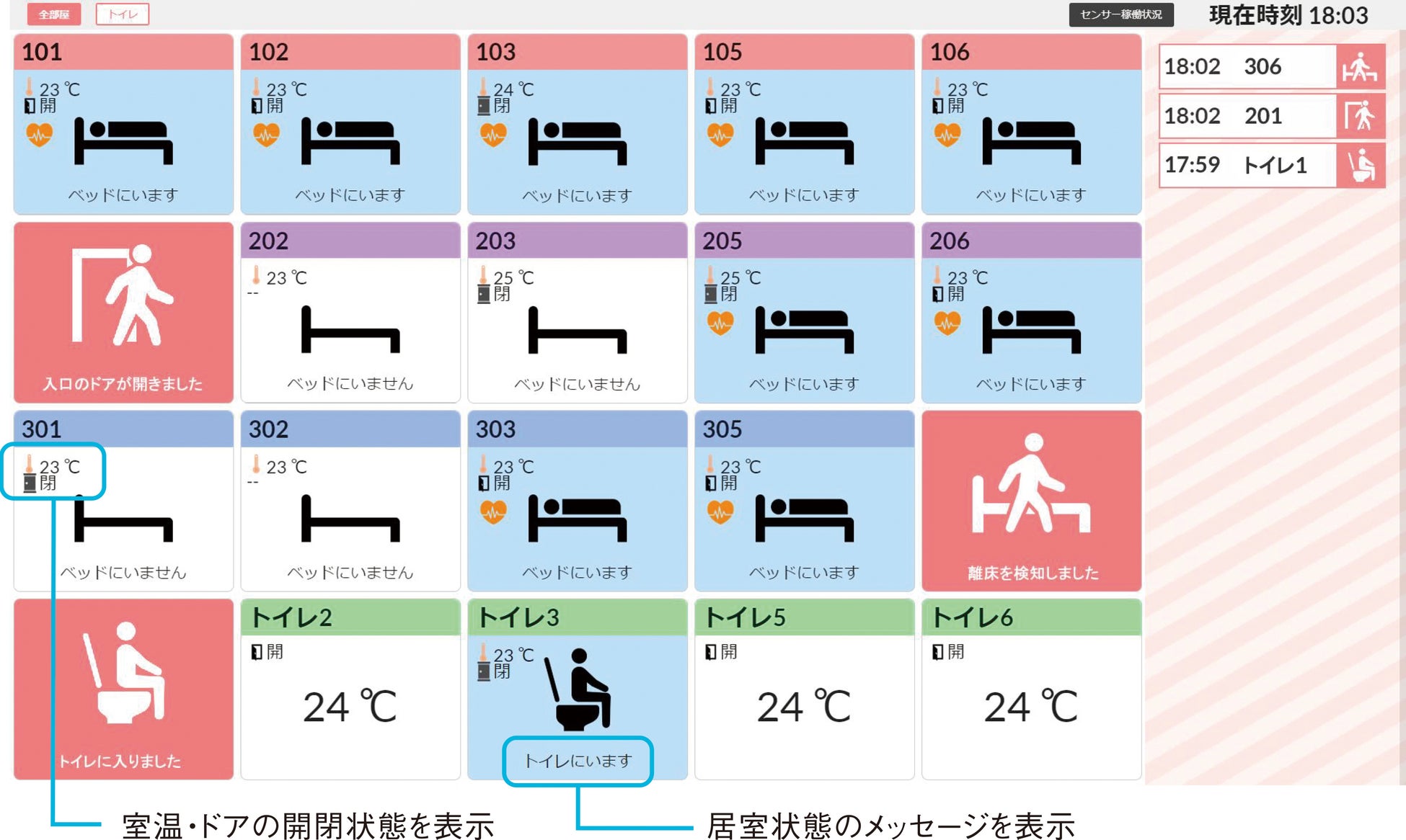 また、職員様の死角を無くし、入居者様の重大事故防止・職員様の負担軽減を実現できます。