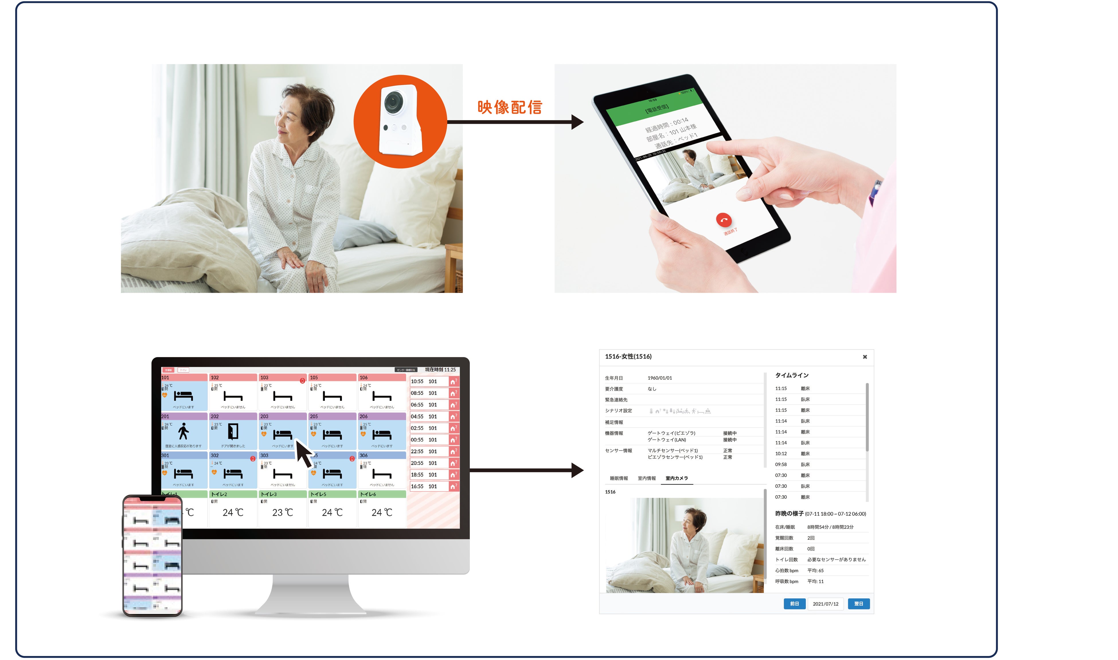「ライブコネクト」や「LCコール」と連動し、映像で居室内の状況を見ながら会話することで訪室の必要性を確認できる為、作業の効率化が図れます。また、転倒や徘徊など正確な状況確認や夜間巡視回数の削減など、映像確認により接触機会を削減し、不必要な訪室を避ける事で睡眠の質を確保、入居者様のQOL向上につなげます。