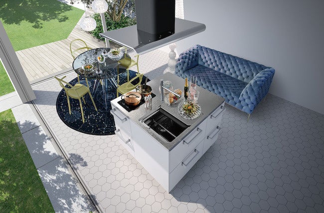 アイランド型レイアウトの特性を活かした、どの方向からもエントリーできる、独自のレイアウトです。全ての面が正面で、表と裏があるシステムキッチンの常識を覆しました。 キッチンを中心に人々が集まりやすく、楽しく調理でき、家族や友人とのコミュニケーションを育みます。