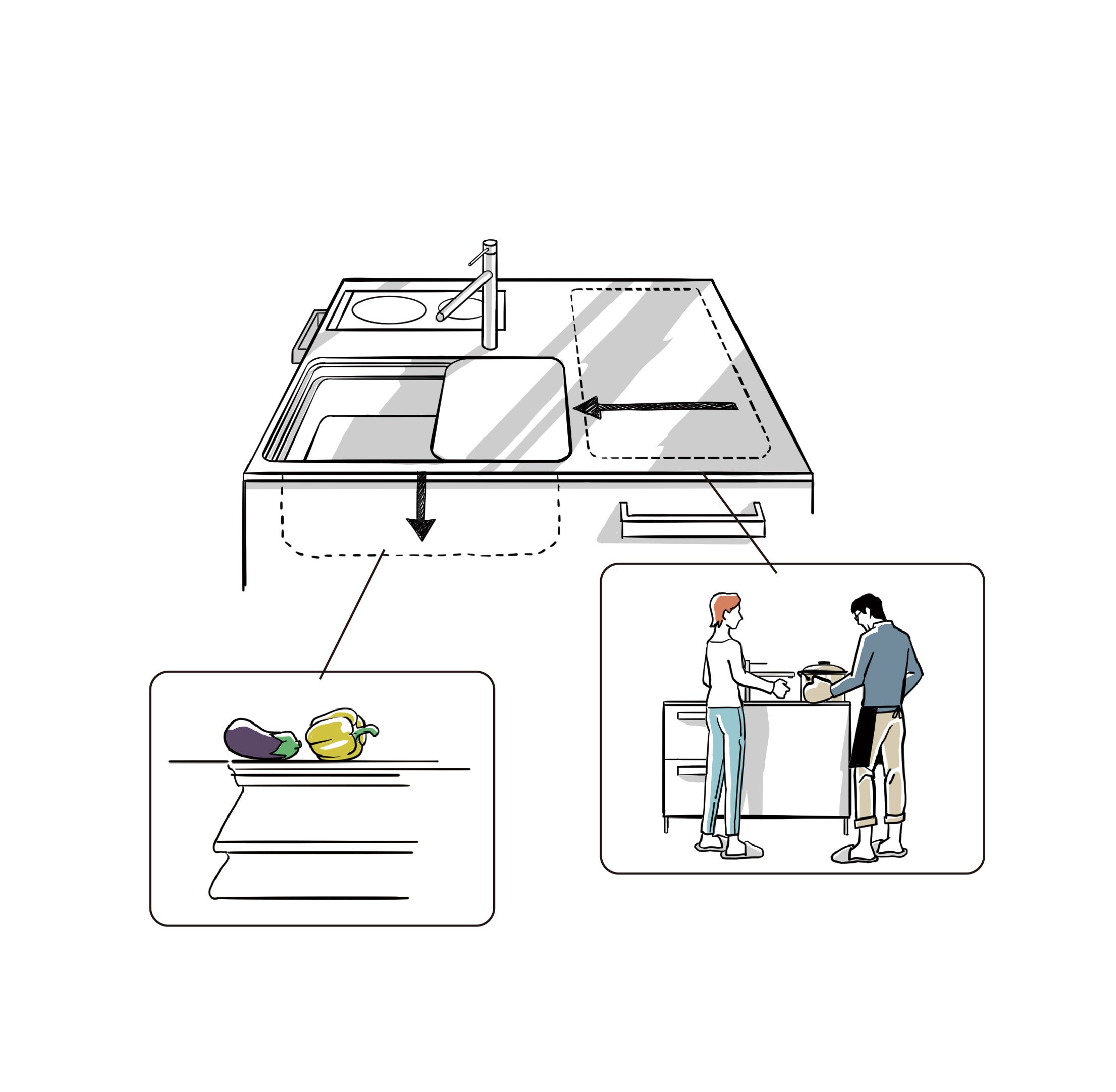 コンパクトなサイズのBAYキューブなら、シンクの前から加熱機器や食洗機、収納、カウンターに至るまでが手の届く距離に。ゼロ動線で調理も片付けもスピーディーにこなせます。 立体活用の3Dシンクと組み合わせることで、小さくても、広い作業スペースと大きなシンクを両立しながら、動線ゼロで効率良く調理できます。