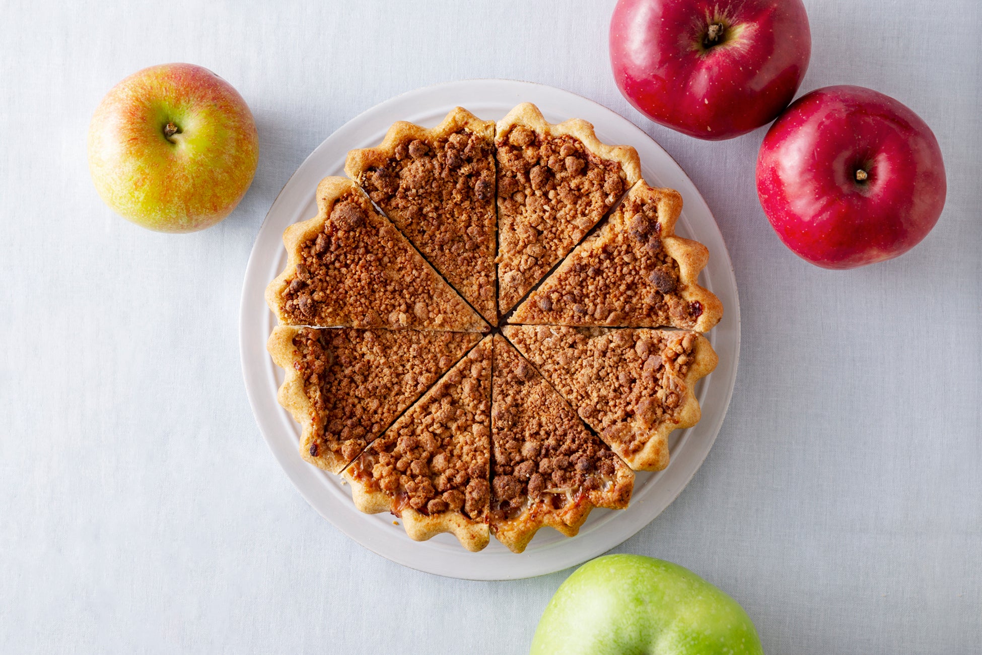 一見、8ピースにカットされたホールのアップルパイに見えますが、1ピースずつ味が異なり、甘いものから酸っぱいものまで、8種類揃ったセットです。味の違いはリンゴ品種の違いです。
