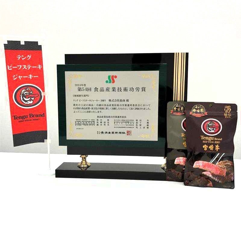 食料品の輸入販売・製造を行う株式会社鈴商(東京都新宿区 代表取締役 鈴木基司、以下鈴商)はこのたび、2024年10月9日に発売した『テングビーフステーキジャーキー宮崎牛 オリジナル/ゆず胡椒味』が、食品産業新聞社主催の「第54回食品産業技術功労賞(地域創生部門)」を受賞しましたことをお知らせします。