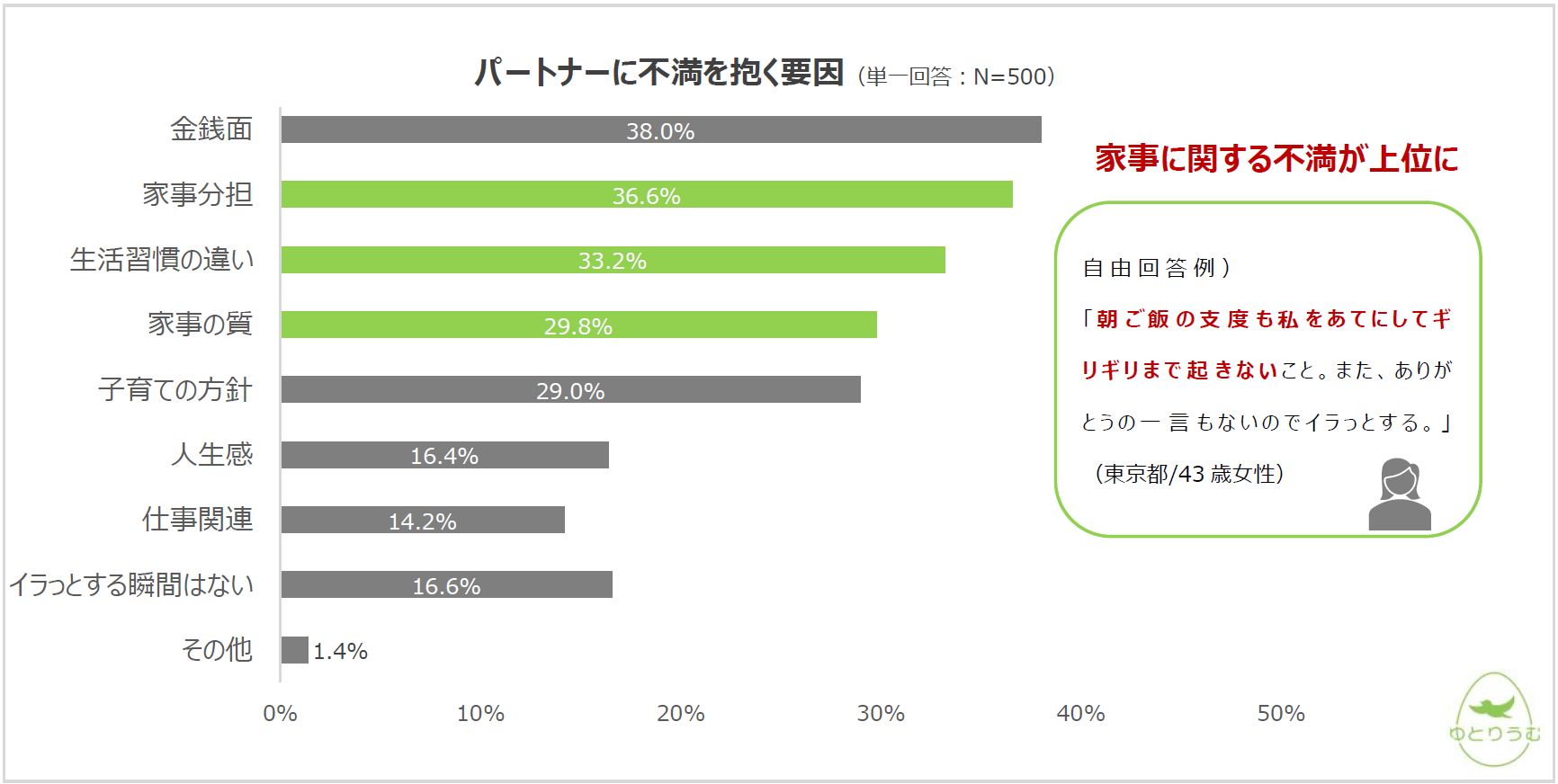✓パートナーに不満を抱く要因は2位「家事分担」3位「生活習慣の違い」4位「家事の質」と家事や生活関連の回答が上位に
