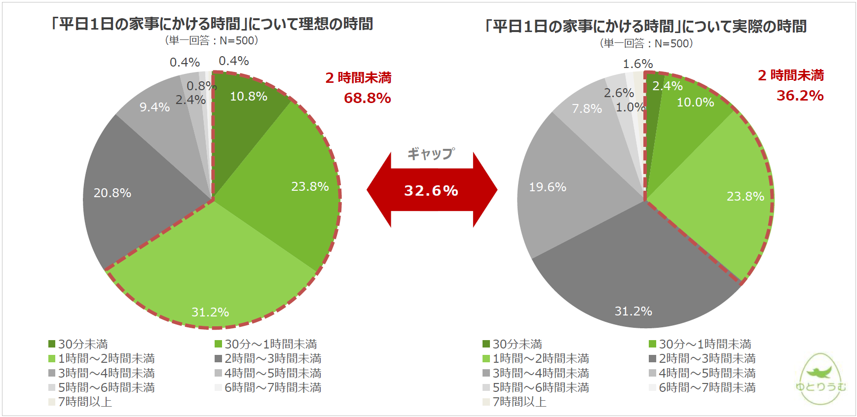 ✓平日1日の「家事にかける時間」を、68.8%の人が「2時間未満に収めたい」と回答しているのに対し、実際に「2時間未満に収められている人」は36.2%