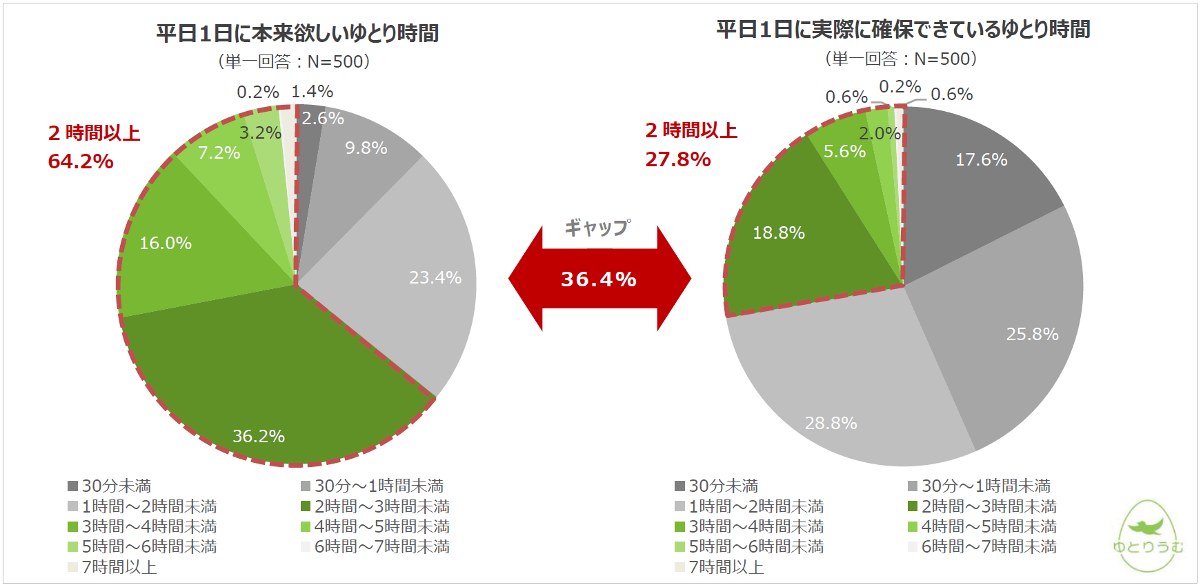 「あなたは本来、平日1日の内どれくらいゆとりの時間が欲しいですか」という問いに対し、2時間以上と答えた人は64.2%だったことに対し、「実際に確保できているゆとり時間はどのくらいですか」という問いに対して、「2時間以上確保できている」と答えた人は27.8%となり、理想と現実のゆとり時間にはギャップがあることがわかりました。