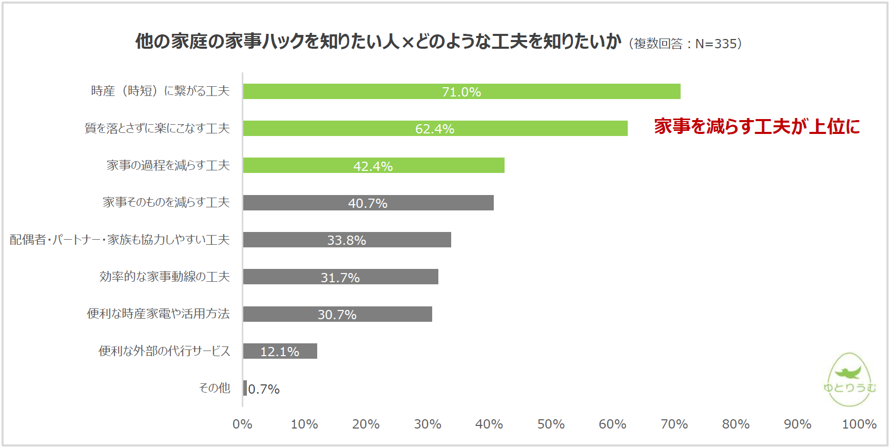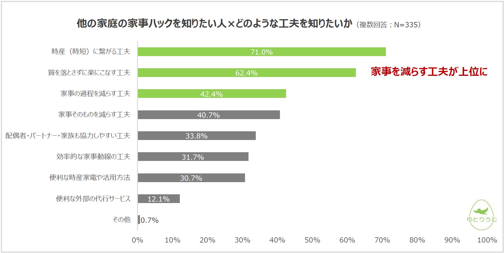 「他の家庭でどのような家事ハックが行われているか知りたい」と答えた方で、「他の家庭の家事について、どのような工夫を知りたいですか」という問いに対し、1位「時産(時短)に繋がる工夫」71.0%、2位「質を落とさず楽にこなす工夫」62.4%、3位「家事の過程を減らす工夫」42.4%となり、家事を減らす工夫が求められていることがわかりました。