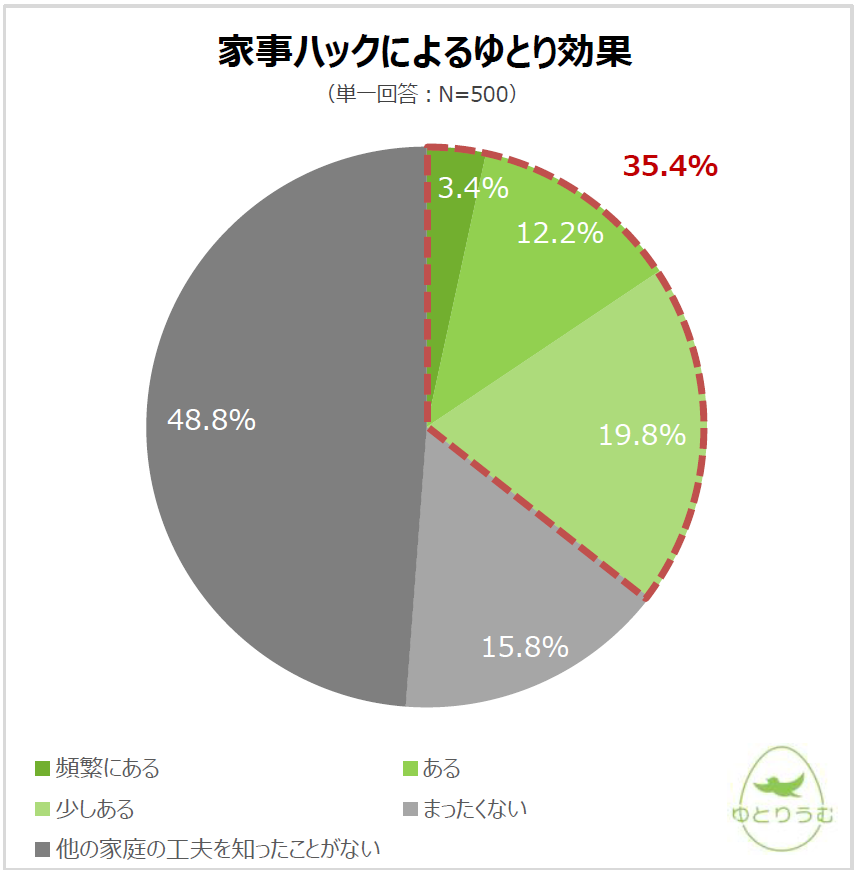 さらに、「実際に他の家庭の家事ハックを知った人」51.2%のなかで、「家事時間にゆとりができたことがある人」は35.4%いたことがわかりました。