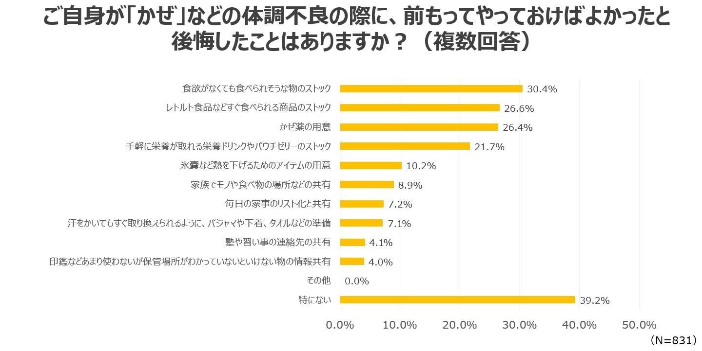 最後に、『ご自身が「かぜ」などの体調不良の際に、前もってやっておけばよかったと後悔したことはありますか?』について伺ったところ、「特にない」という回答が最も多く、次に「食欲がなくても食べられそうな物のストック」、「レトルト食品などすぐ食べられる商品のストック」「かぜ薬の用意」「手軽に栄養が取れる栄養ドリンクやパウチゼリーのストック」という回答が続きました。