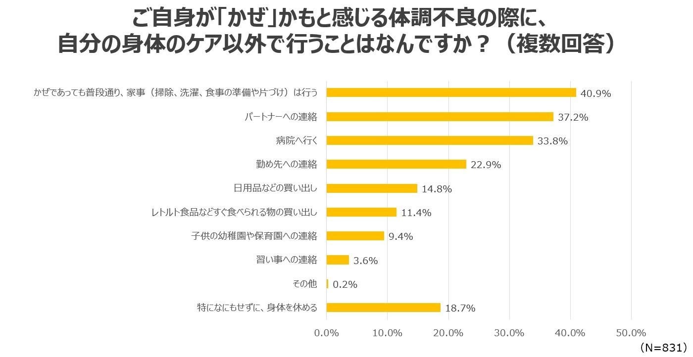 2. 一方、自分の身体のケア以外で行うことについて伺ったところ、「パートナーや勤務先等への連絡」、「食材の買い出し」を抑えて1位になったのは、「かぜであっても普段通り、掃除、洗濯、食事の準備や片づけ等の家事は行う(40.9%)」